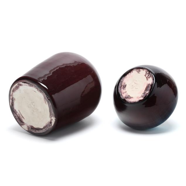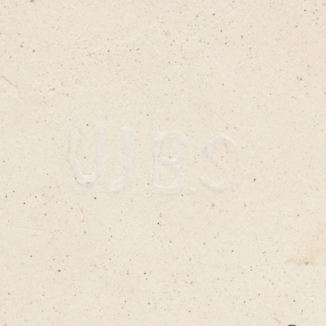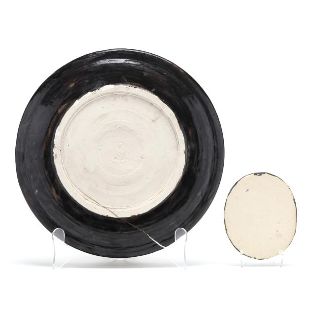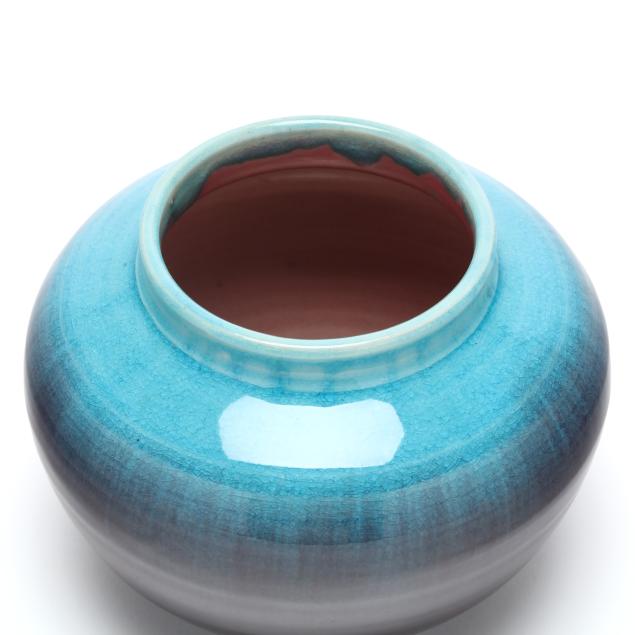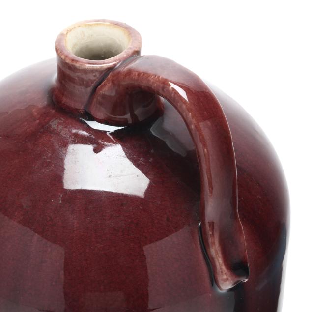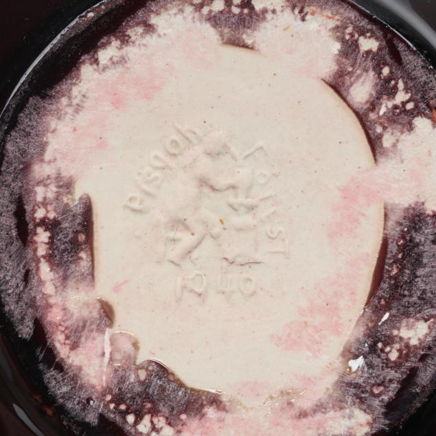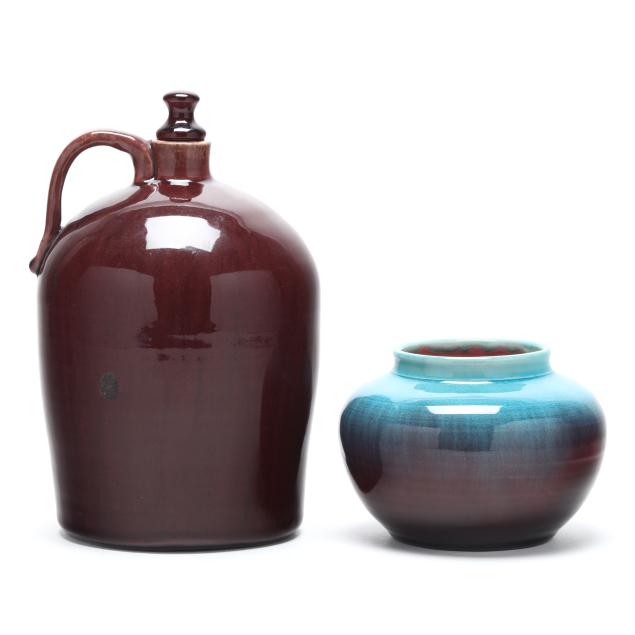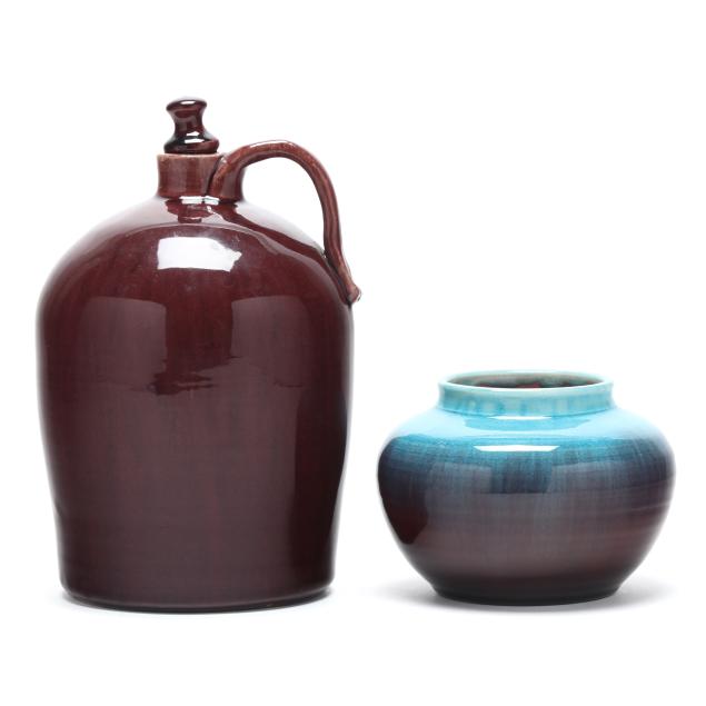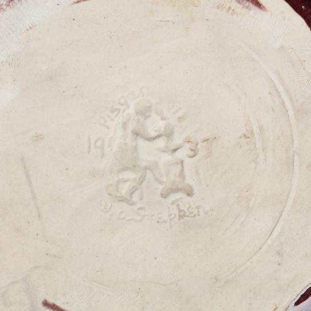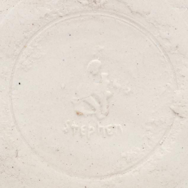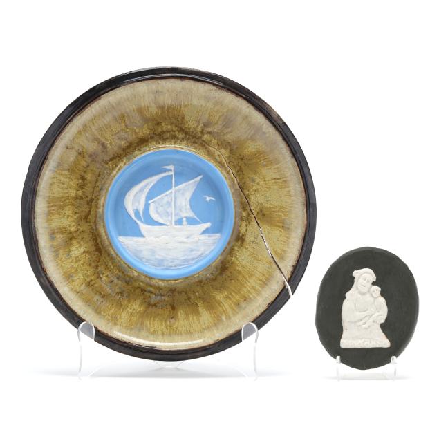 Arden, North Carolina, vitreous semi-porcelain stoneware with applied glazes, the first approximately 1 gallon pottery jug with stopper, decorated in wine crackle glaze, 1937 W. B. Stephen "potter at the wheel" mark to the underside (11 1/2 x 7 1/2 x 7 in.); and a low vase with turquoise over wine crackle glaze, pink interior, 1940 "potter at the wheel" mark (5 x 6 1/2 x 6 1/2 in.); the fourth a large plaque centering a cameo slip glazed sailing scene on light blue ground, 1946 "potter at the wheel" mark (11 1/4 in. diameter); and a small cameo oval plaque of the Madonna and child, with dark green glaze, signed W.B.S. to the reverse (4 3/4 x 4 in.)