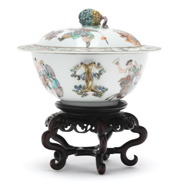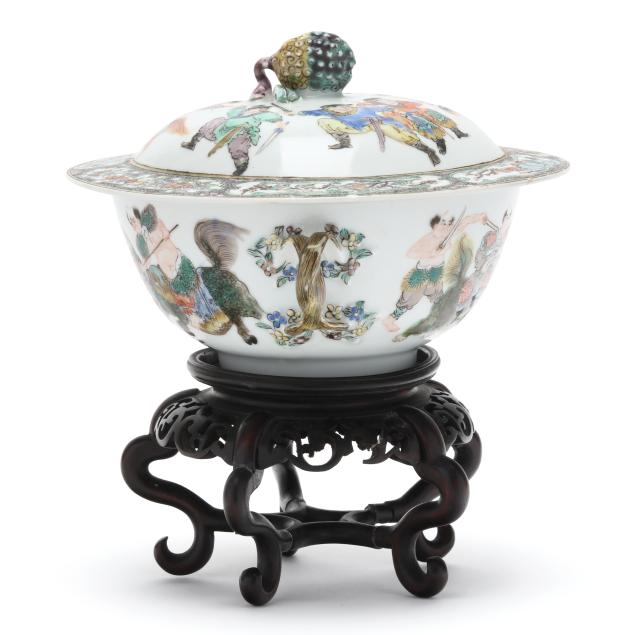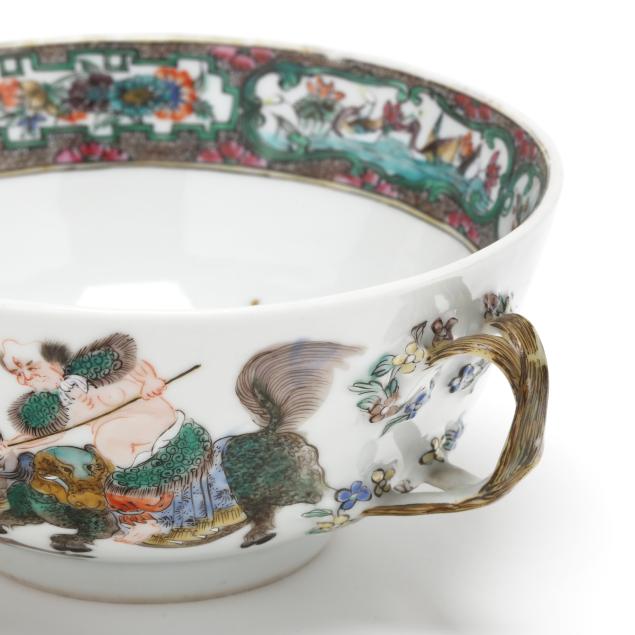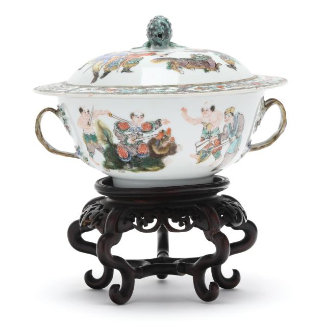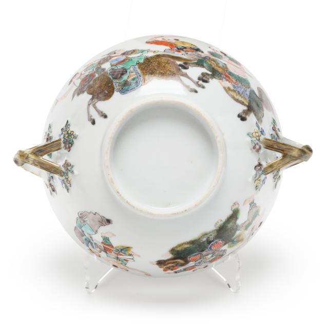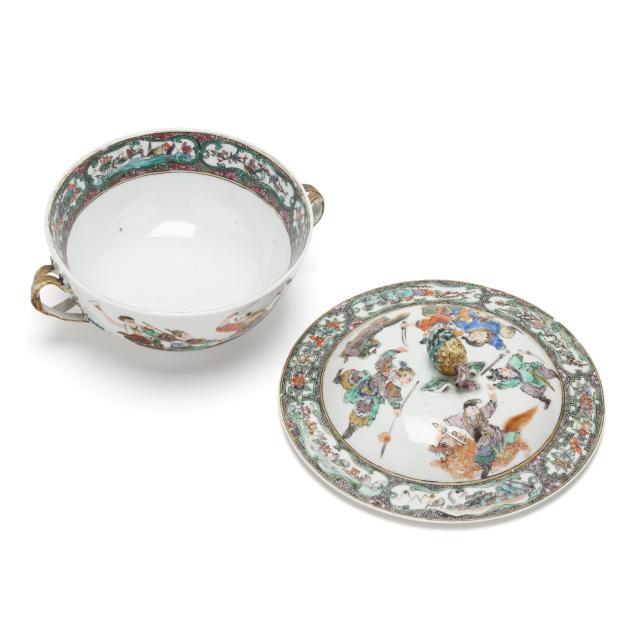 Mid- to late 19th century, porcelain finely hand-painted in famille verte enamels with immortals and attendants riding mythical beasts, body is flanked by braided gilt handles, the cover with a decorative border of floral cartouches and scrolling foliage, topped with a pomegranate finial, unmarked.