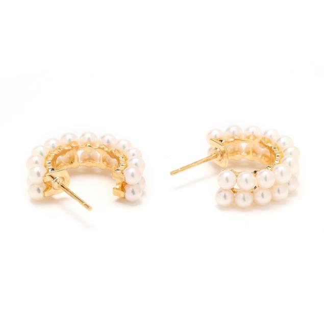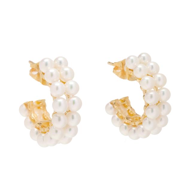 Set with a double row of round cultured pearls (3.5-4mm), completed with a post and friction back, earring XRF testing 18KT, backs stamped with Mikimoto maker's mark and 750.