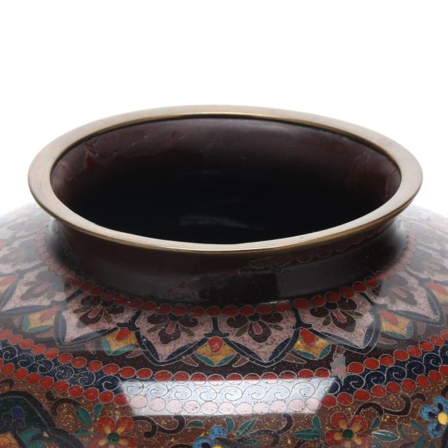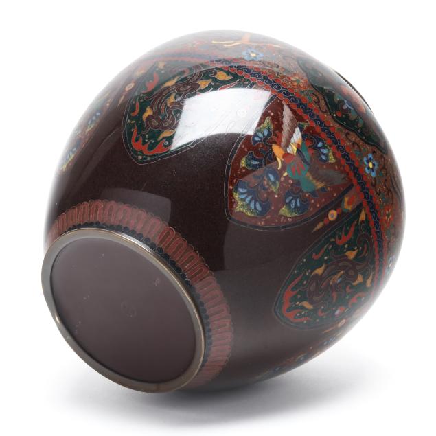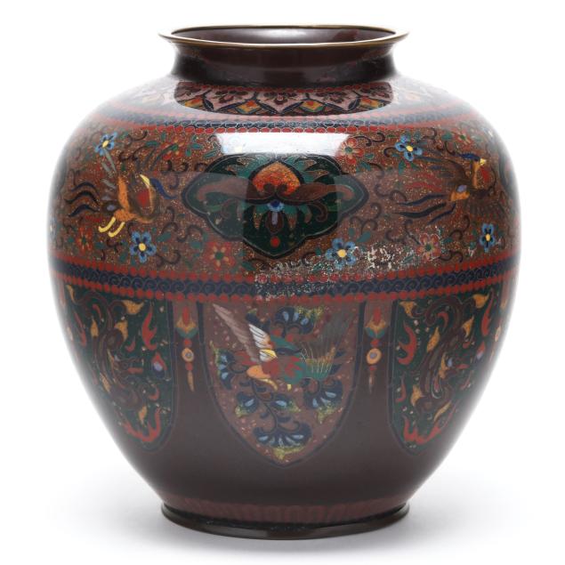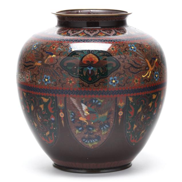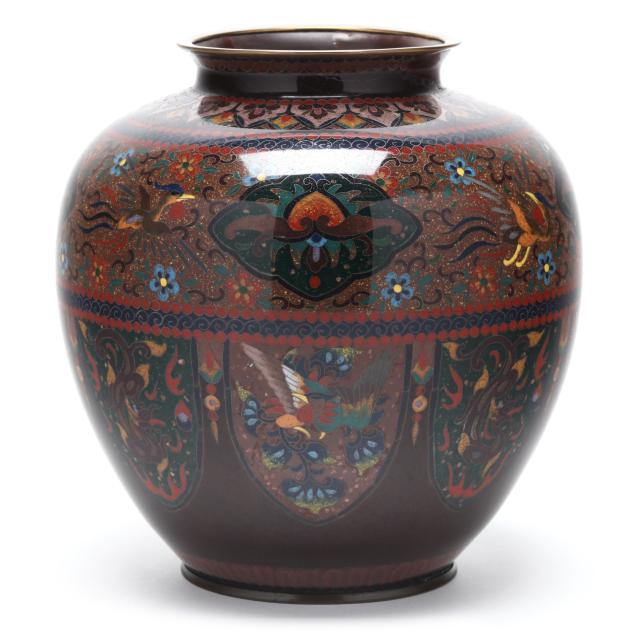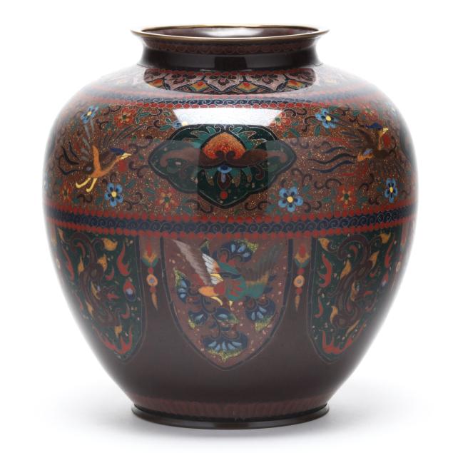 Meiji or Taisho period, early 20th century, a baluster-form vase decorated in polychrome cloisonné enamels with silver wire of phoenix and floral motifs reserved against a brown