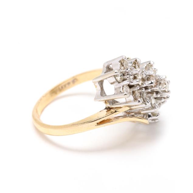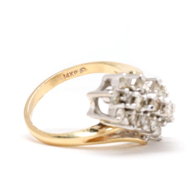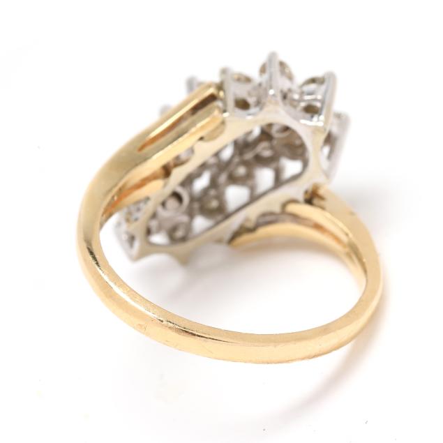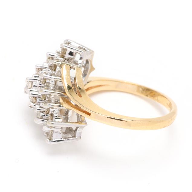 Ring in bypass form, prong set with full cut round diamonds weighing approximately .75 total carat (J-K color, I1-I2 clarity), stamped with a maker's mark and 14KP.