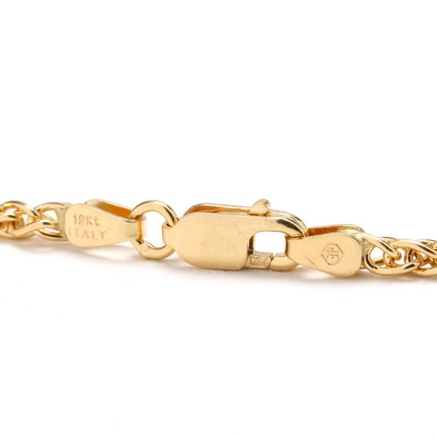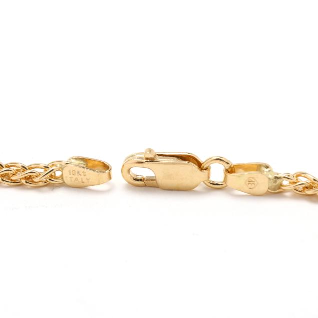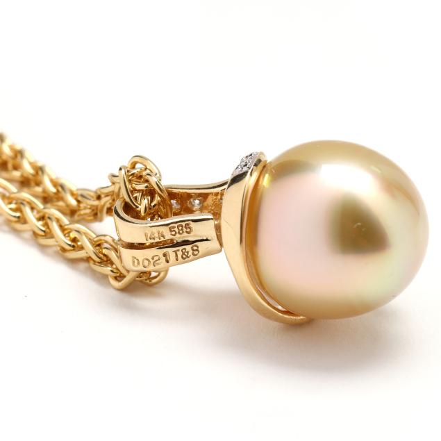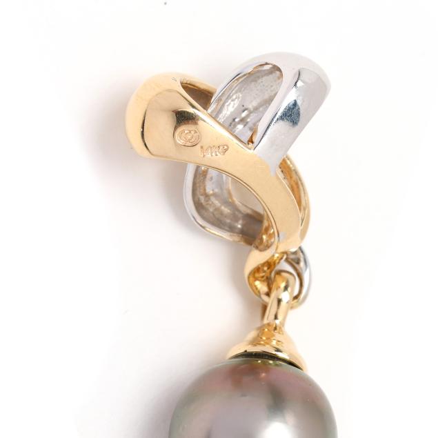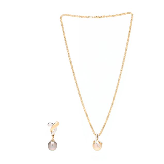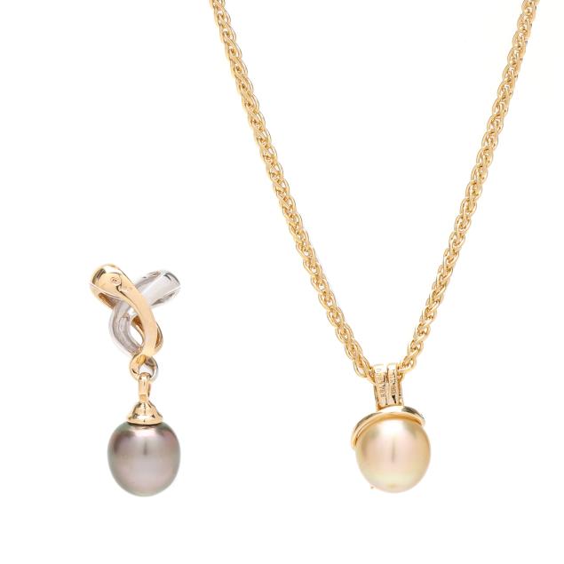 To include: a gold pendant set with a drop shape South Sea pearl (14 x 12mm), and bead set with full cut round diamond melee, suspended from a wheat chain completed with a lobster clasp, pendant stamped 14K 585 / D021 T&S, chain stamped with a maker's mark and 18Kt / Italy (pendant 13/16 in.; necklace 16 in.) (pearl displays a yellow bodycolor with orient, very good luster, lightly spotted surface, and acceptable nacre); and a bi-color gold slide with twist design, suspending an oval Tahitian pearl (12.5 x 11.5mm), stamped with a maker's mark and 14KP (1 3/8 in.) (pearl displays a dark gray bodycolor with orient, excellent luster, lightly spotted surface, and acceptable nacre).