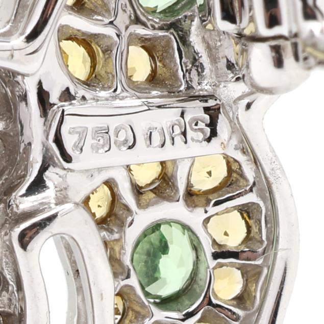 Set to the body with full cut round diamond melee and set to the wings with round cut yellow sapphire and green garnet, completed with a locking double pin stem, stamped 750 DRS.