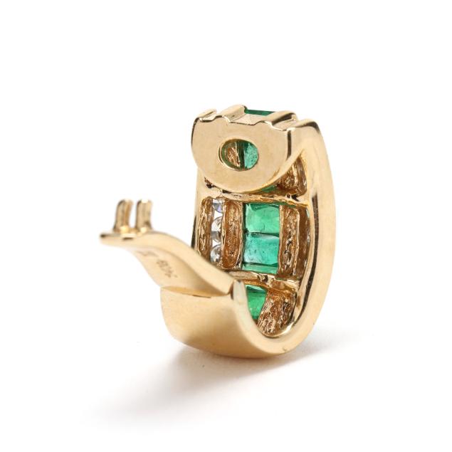 Vertically set with rectangular cut emeralds and channel set to each side with full cut round diamonds weighing approximately .25 total carat (H-I color, SI2-I1 clarity), completed with a hinged bail, stamped with a maker's mark and 14KT.