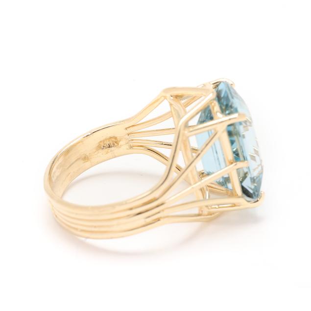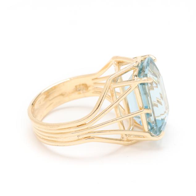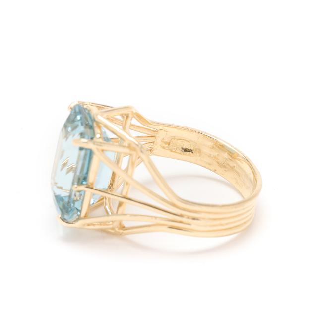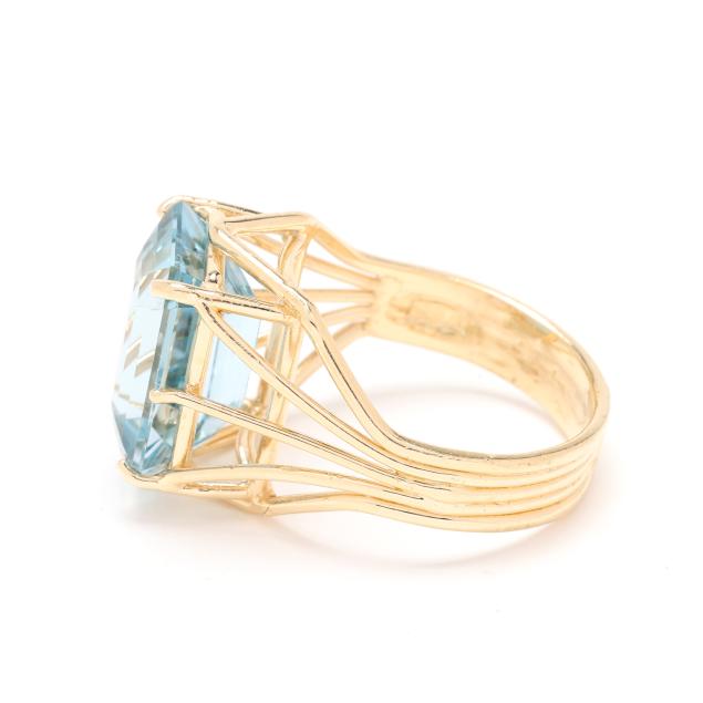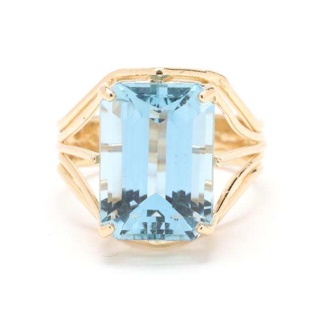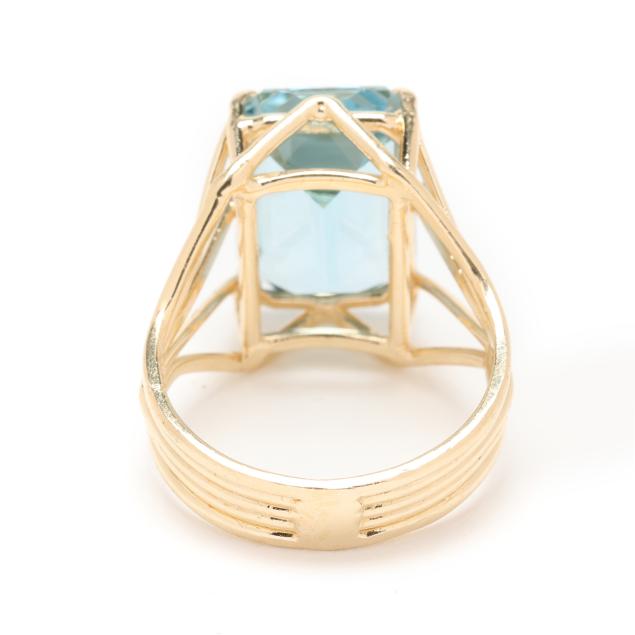 Centered on an emerald cut blue topaz (14.0 x 10.0 x 7.3mm) weighing approximately 9.50 carats set within a wire motif ring, stamped 14K / 585.