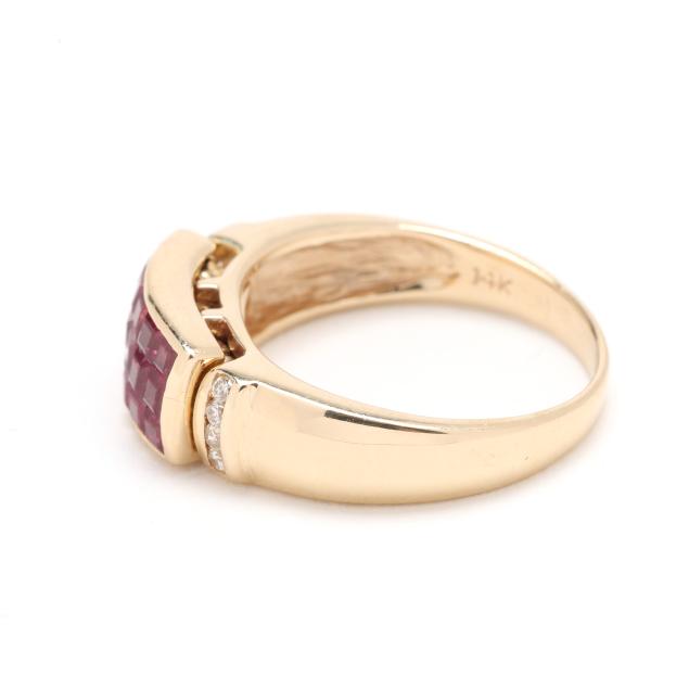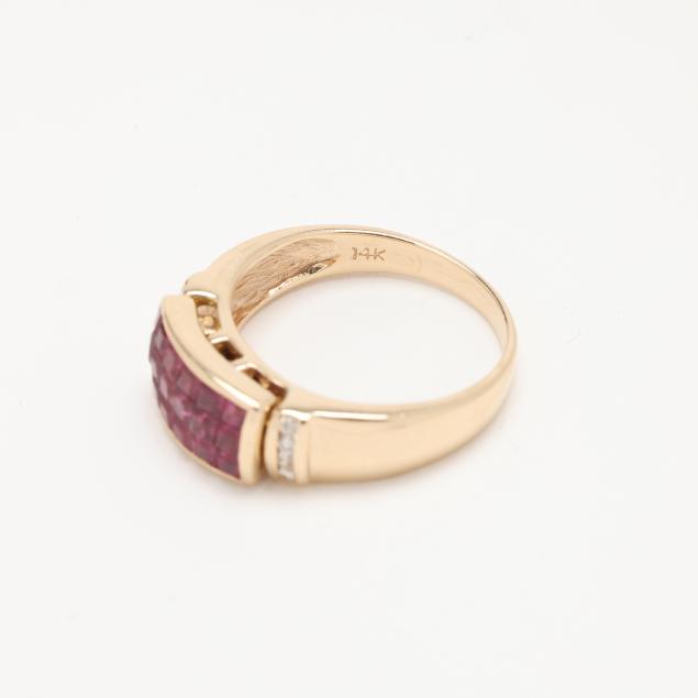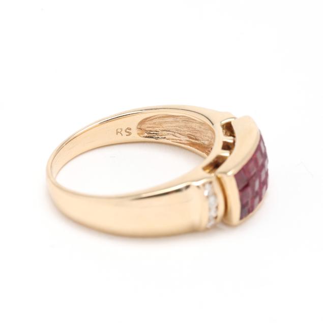 Invisibly set with square cut rubies weighing approximately 1.25 total carats in a removable setting for use with interchangeable elements, channel set to each side with full cut round diamond melee, stamped 14K RS.