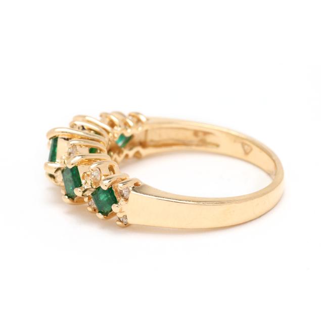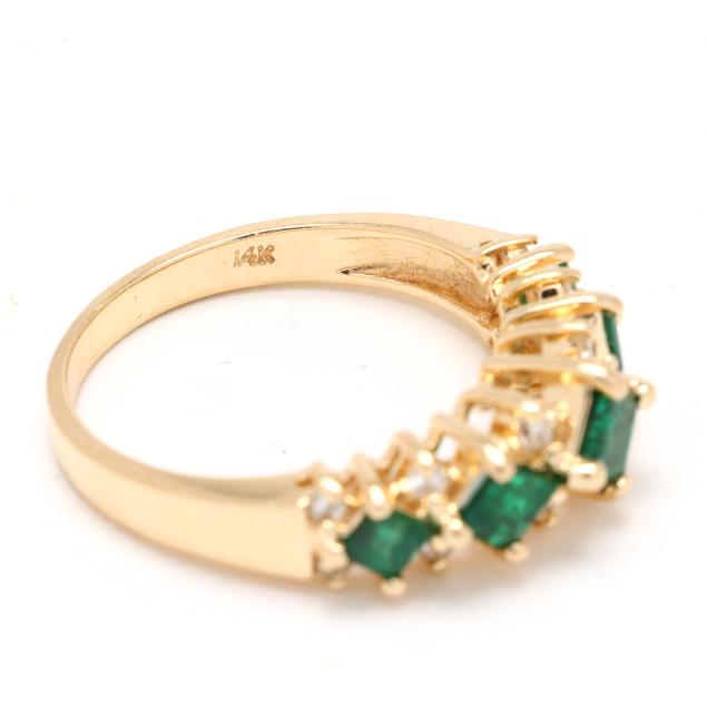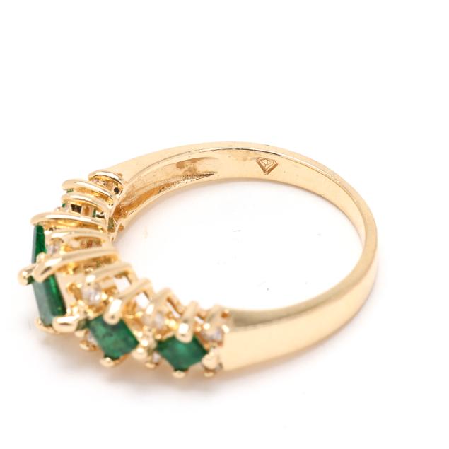 The pyramid style ring set with square cut emeralds and full cut round diamond melee, stamped with a maker's mark and 14K.