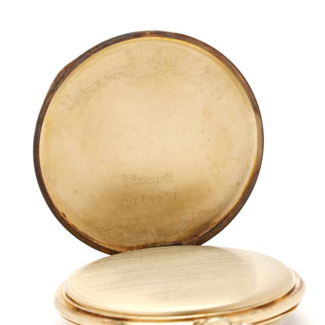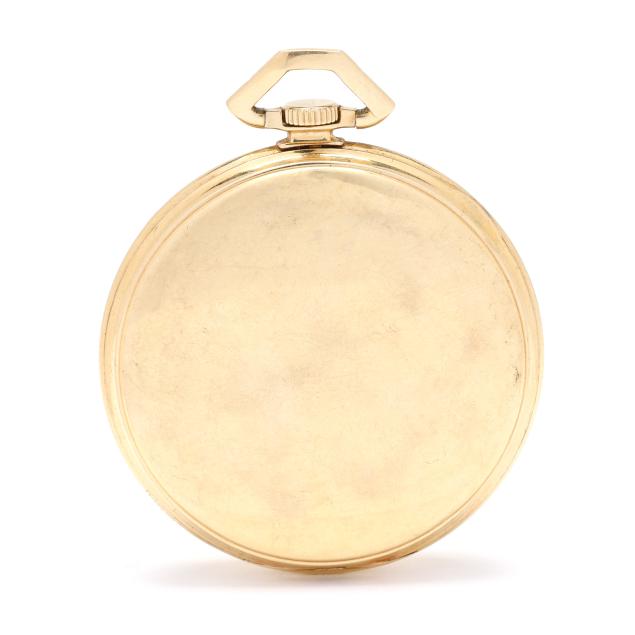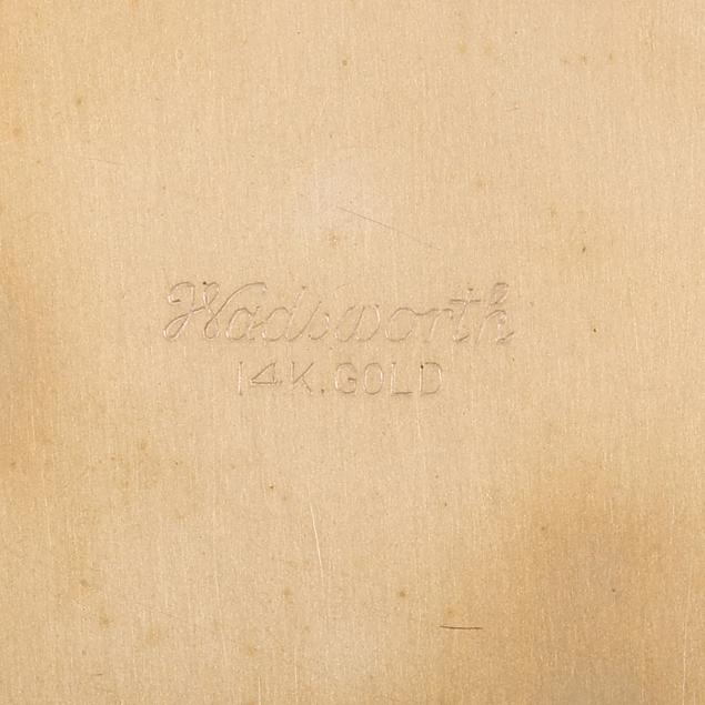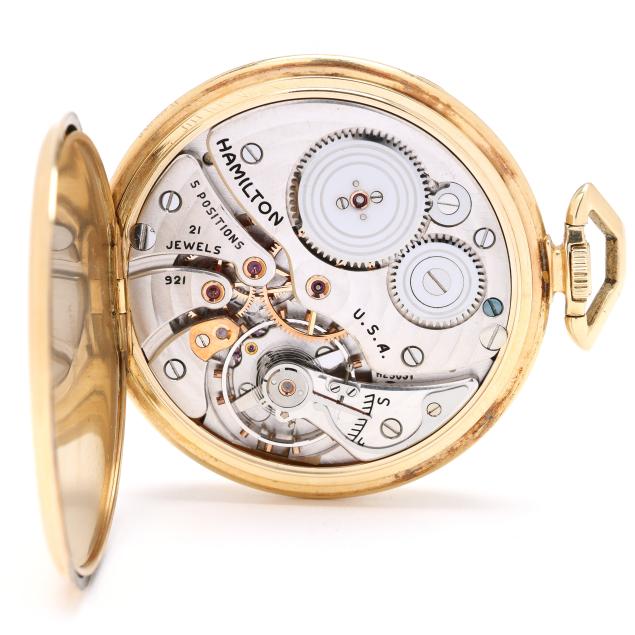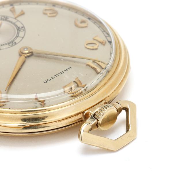 Circa 1944, stem set and wind, twenty-one jewels, grade 921, serial number H23031, the open face case with polished bezel and caseback, the signed silver-tone dial with gold-tone Arabic numeral hour markers, gold-tone lance hands, and subsidiary second dial at 6:00 hour, the movement signed and numbered 921 / H23031, the case interior signed and numbered Hamilton Watch Co. / Wadsworth / H654478 / Lancaster Pa., and marked 14K Gold, case and cuvette testing 14KT.