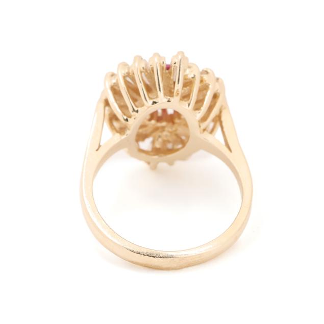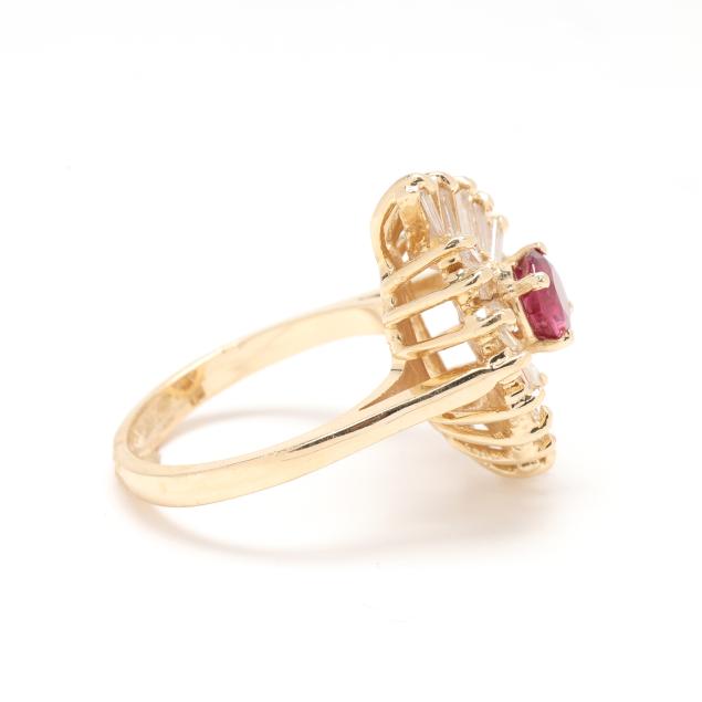 Centered on a round cut ruby (5.5 - 5.6 x 3mm) weighing approximately .60 carat within a surround of baguette cut diamonds weighing approximately 1.0 total carat (G-H color, SI1-SI2 clarity), stamped 14KP.