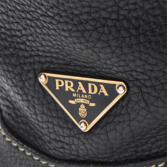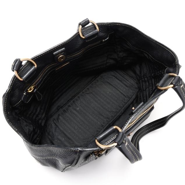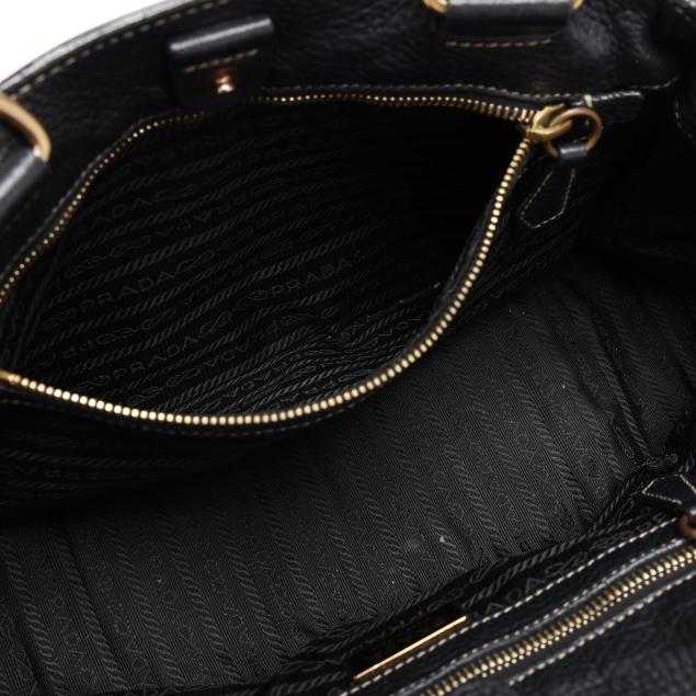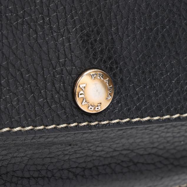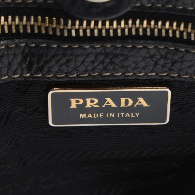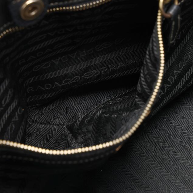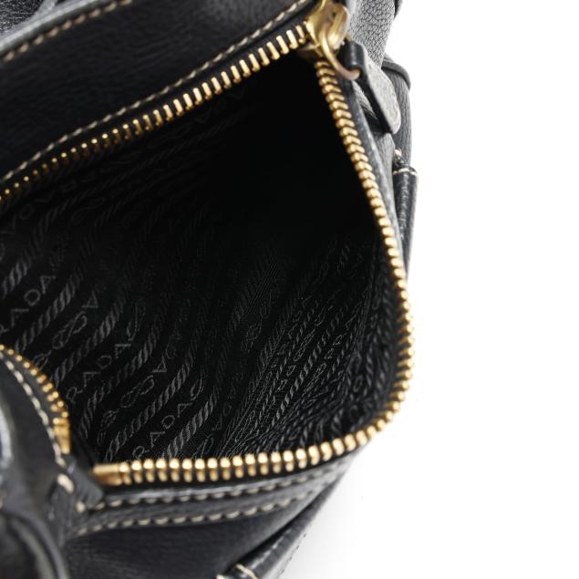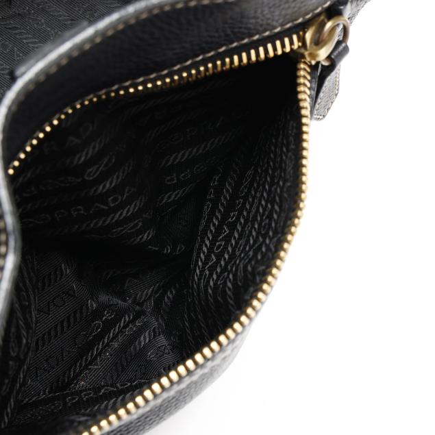 The exterior in black leather with gold-tone hardware, flat leather straps, side button pocket, side zipper pocket, and metal brand tag to the side, the interior in black fabric with Prada stitching, two side zipper pockets, and a metal brand tag stating made in Italy.