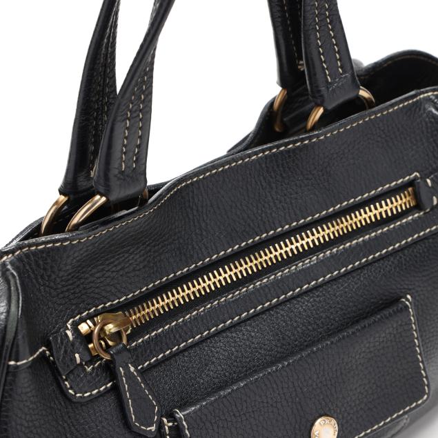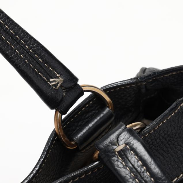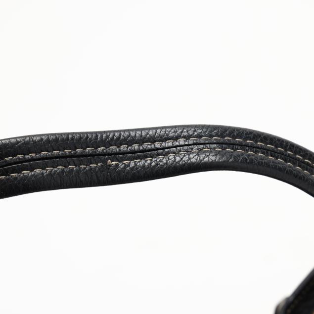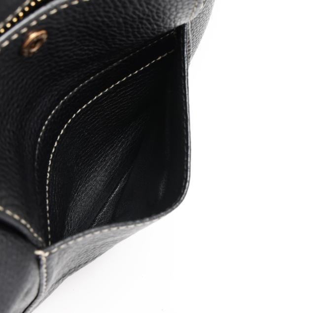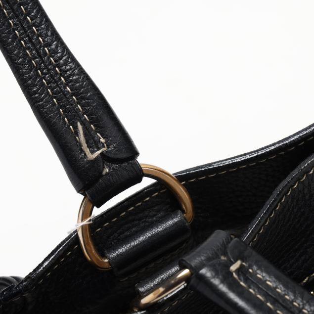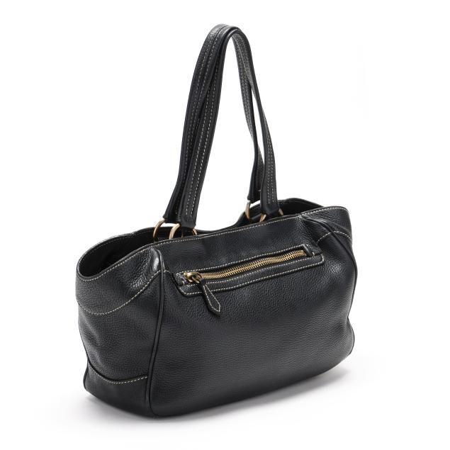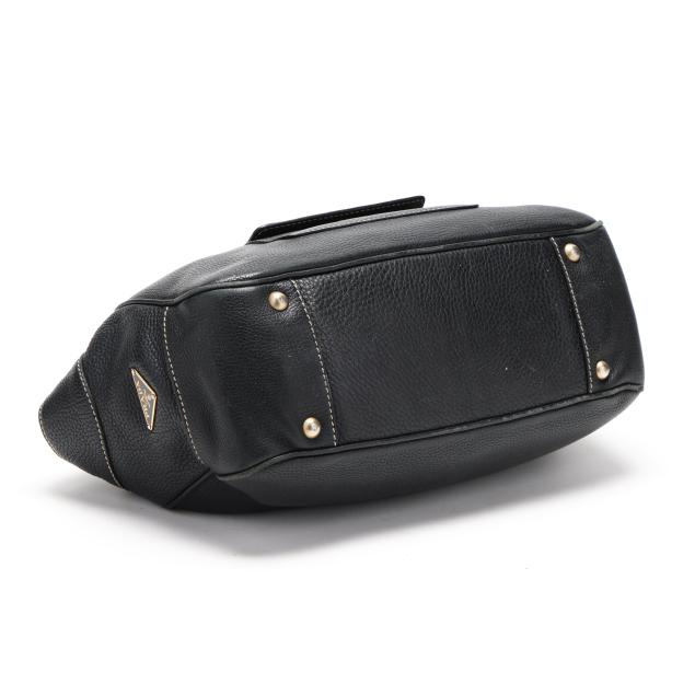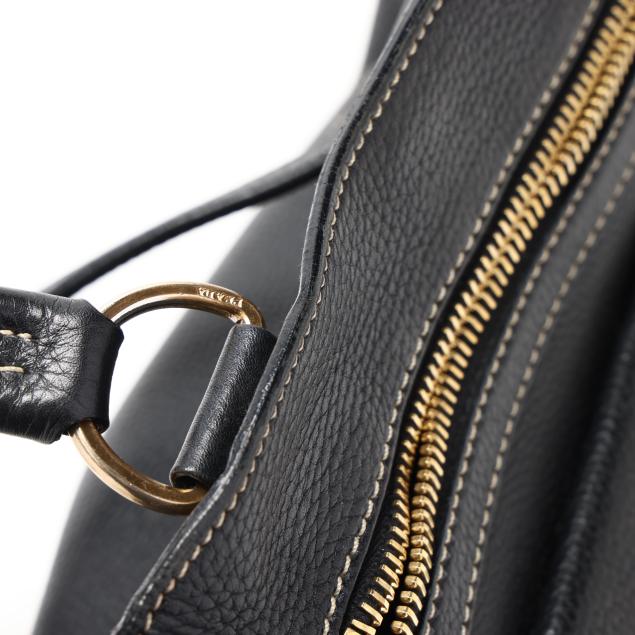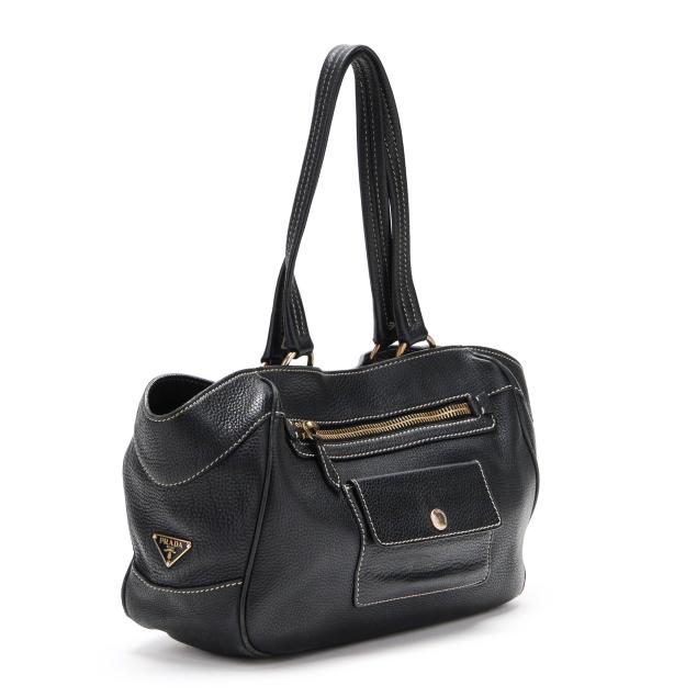 The exterior in black leather with gold-tone hardware, flat leather straps, side button pocket, side zipper pocket, and metal brand tag to the side, the interior in black fabric with Prada stitching, two side zipper pockets, and a metal brand tag stating made in Italy.