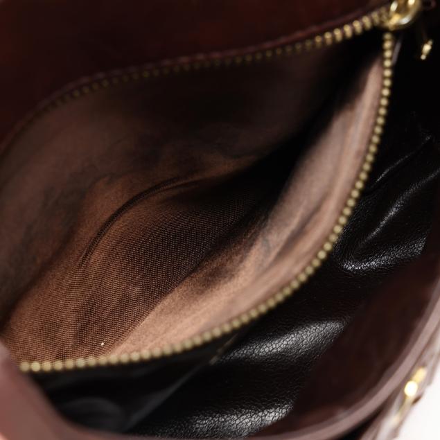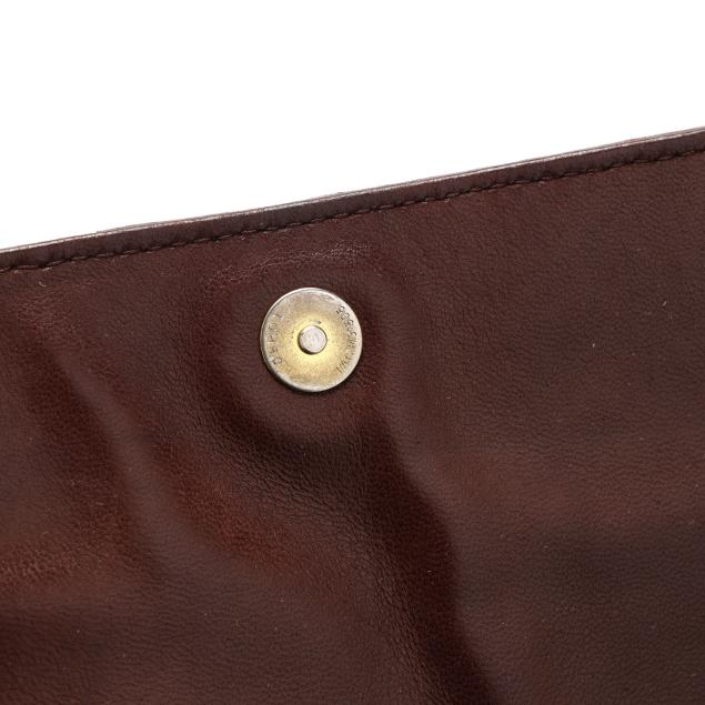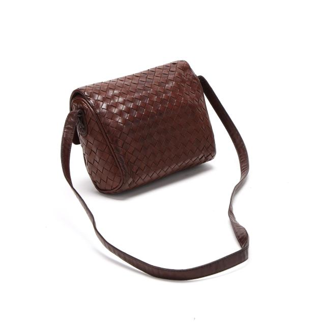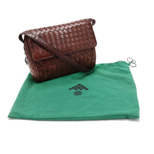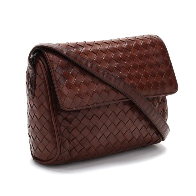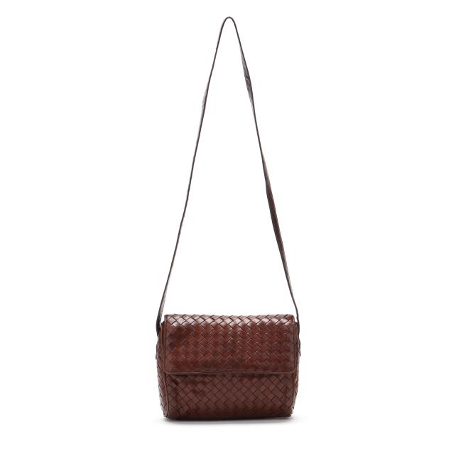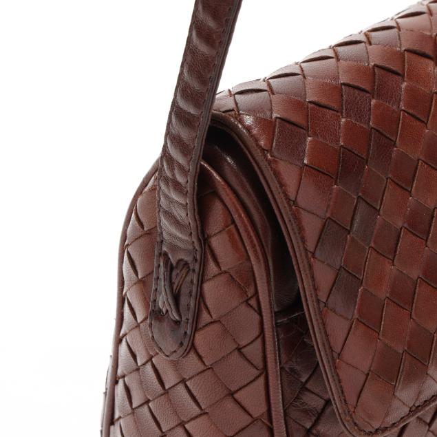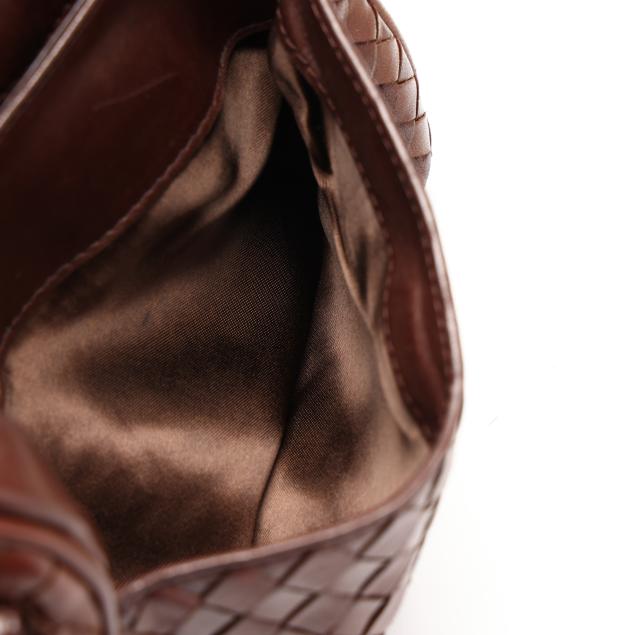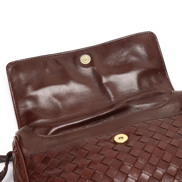 The exterior in woven brown leather with flat brown leather shoulder strap and flap with magnetic clasp over main and side pocket, the interior in brown leather with side zipper pocket, mirror, and metal brand tag stating made in Italy.