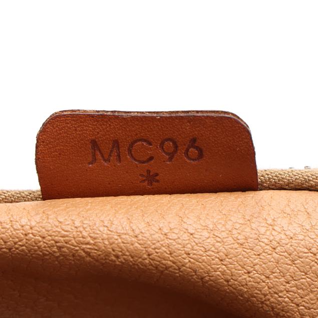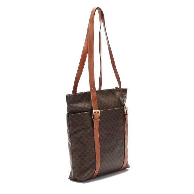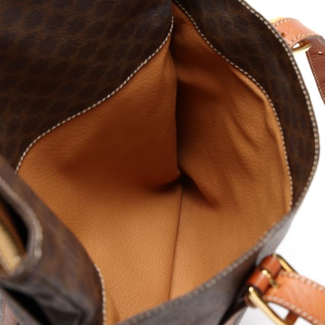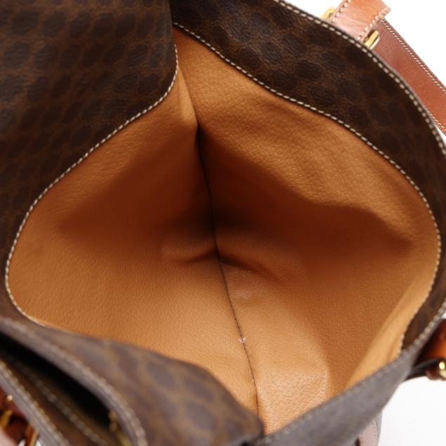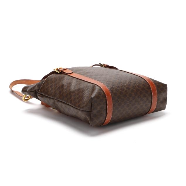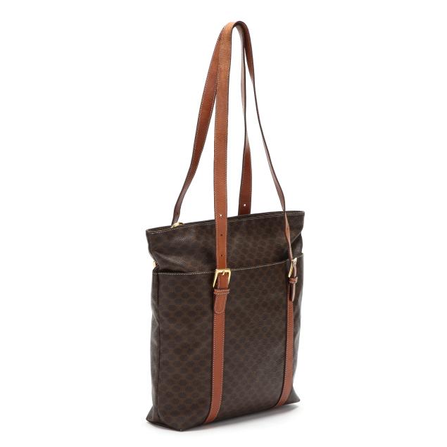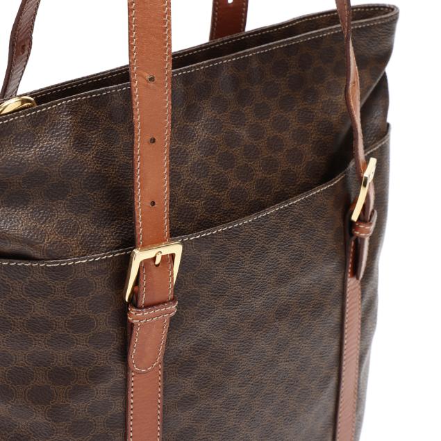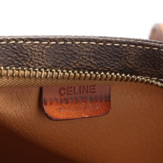 The exterior in Macadam canvas with leather trim, gold-tone hardware, flat leather handles, two exterior pockets, and main zipper pocket with circular Celine zipper pull, the interior in brown leather with leather brand tag stating made in Italy.