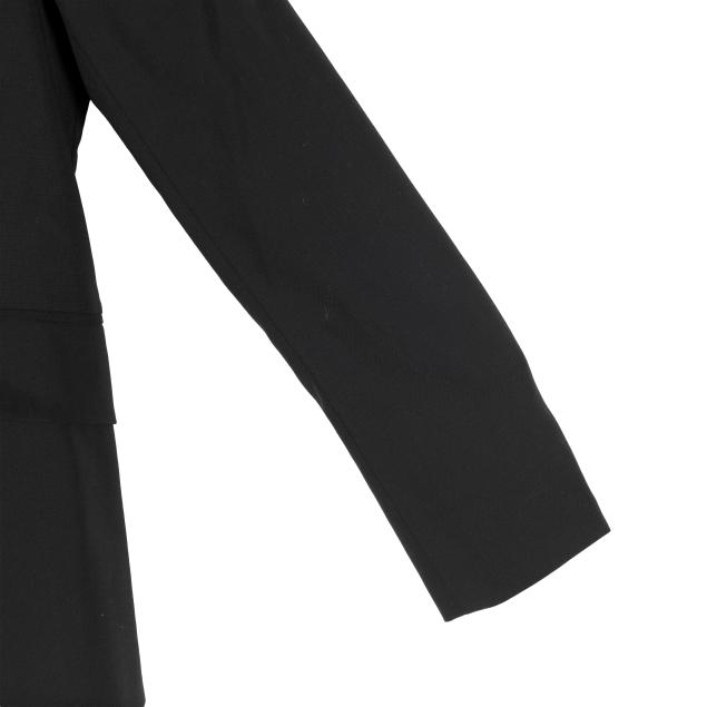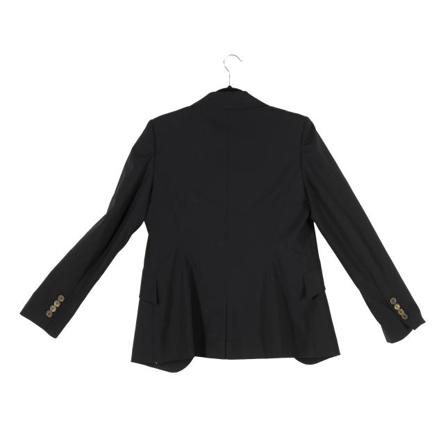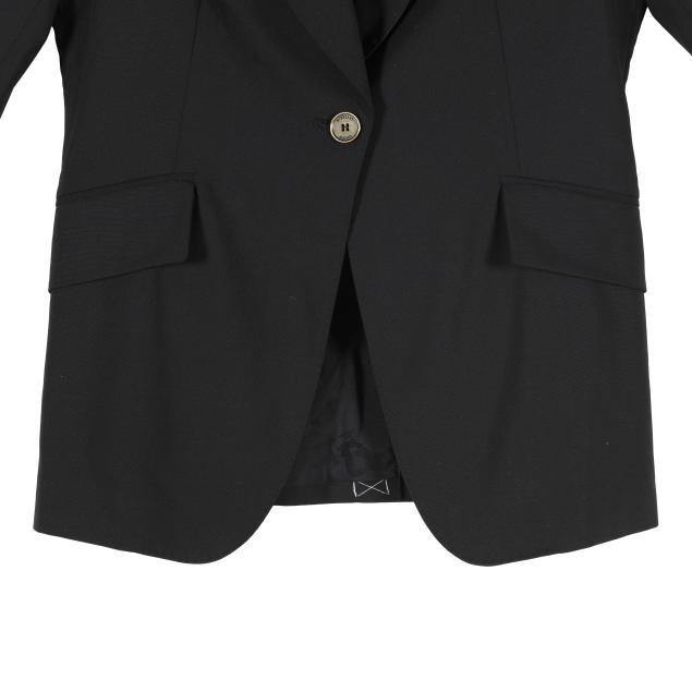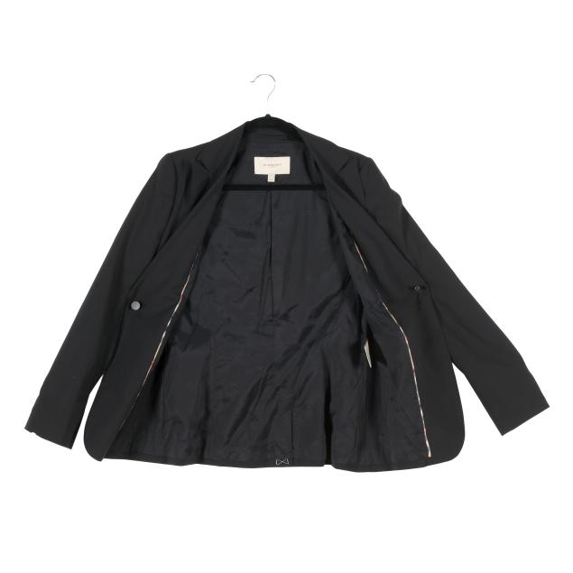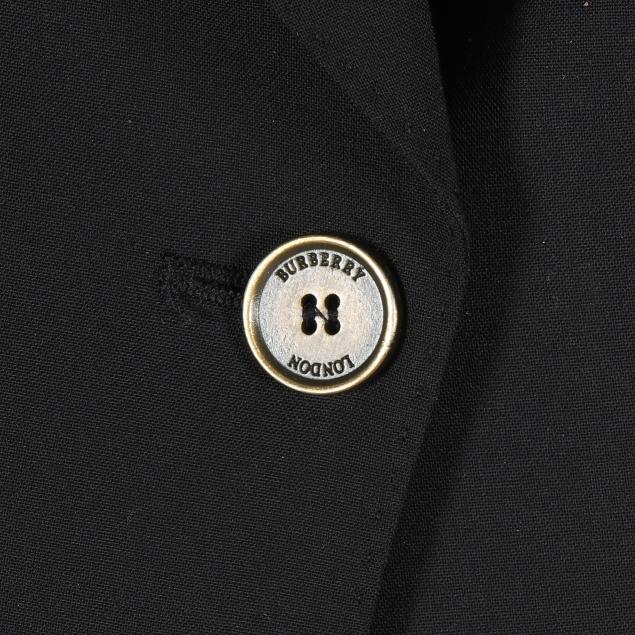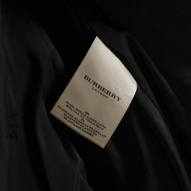 Made in Italy, wool blend, black exterior, interior with equestrian design details and Burberry check edge, decorative flap and slit pockets, single button closure, labeled Burberry London.