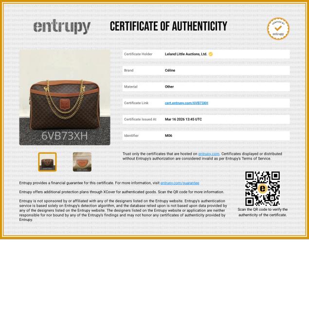 Macadam canvas with leather trim, gold-tone hardware, chain link strap, single side pocket, leather brand tag, and zipper main pocket, the interior in tan pleather with single side zipper pocket and leather brand tag stating made in Italy.
