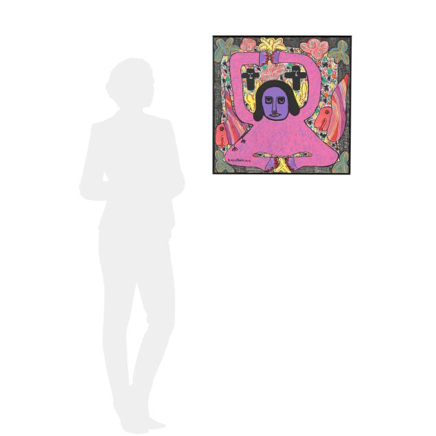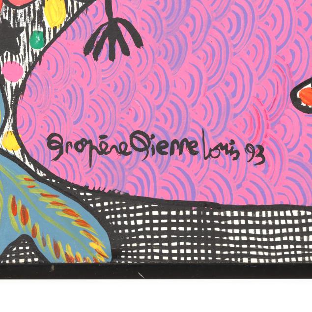 Private Collection, Raleigh, North Carolina Prospère Pierre-Louis was a Haitian painter and a leading figure of the Saint Soleil art movement, known for his vibrant, spiritual depictions of Vodou spirits and mystical figures. Born in Bainet near Jacmel, Haiti, he had little formal education and was exposed to Vodou traditions early in life through his father, a houngan (Vodou priest). As a teenager he moved to Port-au-Prince, where he eventually joined the Saint Soleil artistic community organized by Maud Robard and Jean-Claude “Tiga” Garoute, becoming one of its most prominent painters. After the group dissolved, he continued working with several members in the collective Cinq Soleils, further developing his distinctive, highly expressive style.