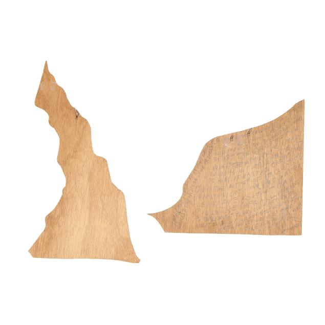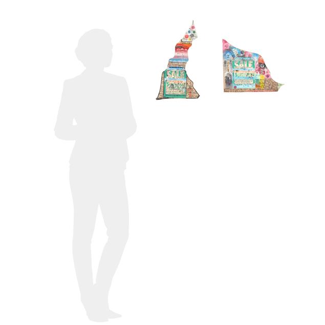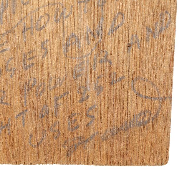 1984, both polychrome painted cut wood with applied paper "SALE" tags, signed and dated with musings inscribed to whole, the shorter with additional musings to verso, hole drilled to both with wire for wall display.