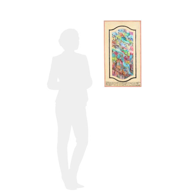 1984, polychrome painted wood cabinet door featuring people and castles, signed and dated with musings to the base, additionally signed and dated to verso with wire for wall display.