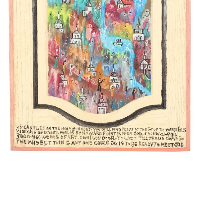 "25 Castles in the Holy Jungles - You will find Jesus at the top of the waterfalls / visions of other worlds by Howard Finster from God - 6:4:Nov-21-1984 / 3000-960 works of art - on nilon [sic] door - to last till Jesus comes. / The wisest thing any one could do is to be ready to meet God."