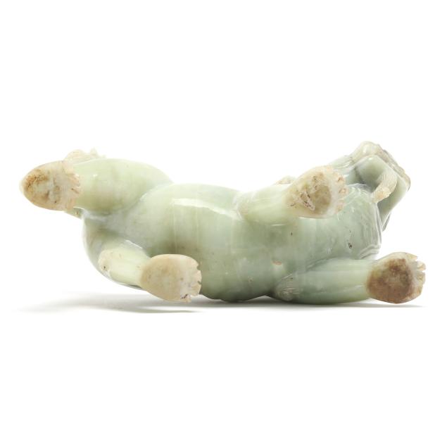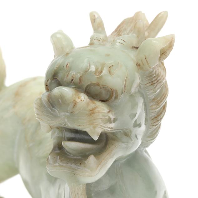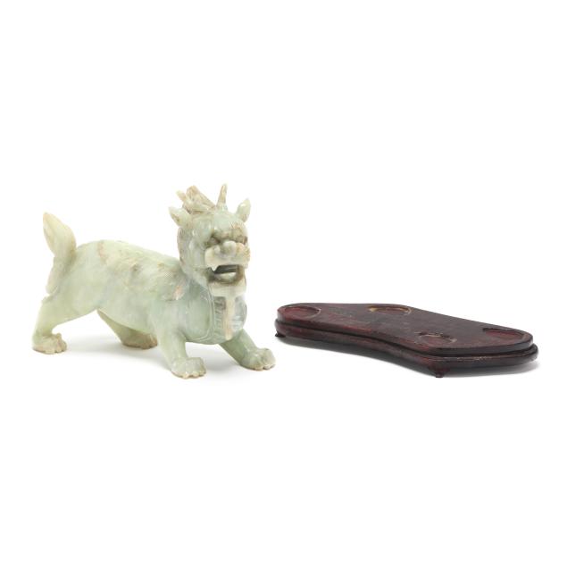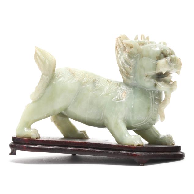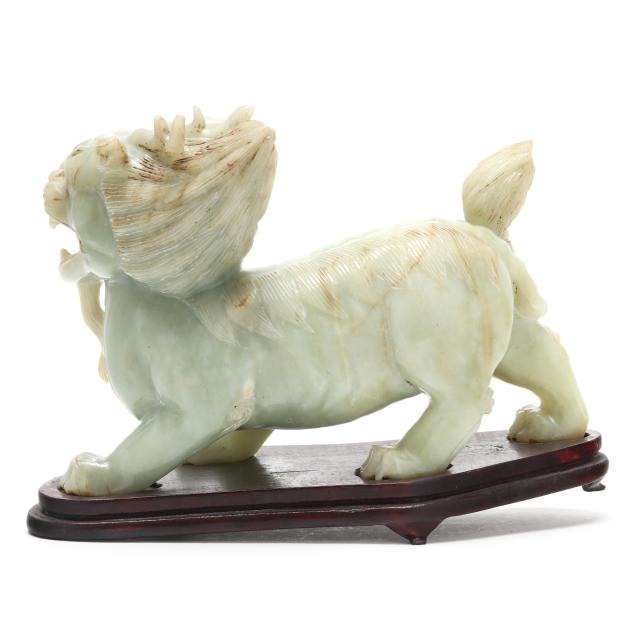 20th century, carved pale celadon hard stone, possibly jade, figure of a striding mythical beast, the mane and tail finely incised, the stone with light russet inclusions, presented together with a fitted wood stand and a presentation box.