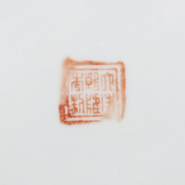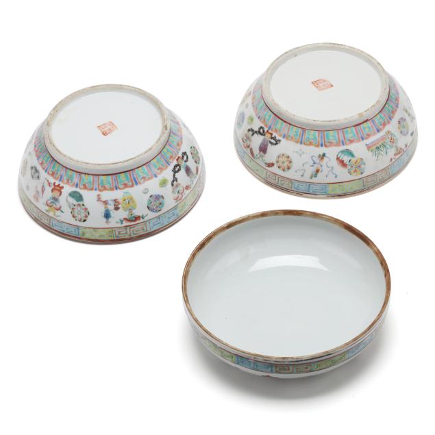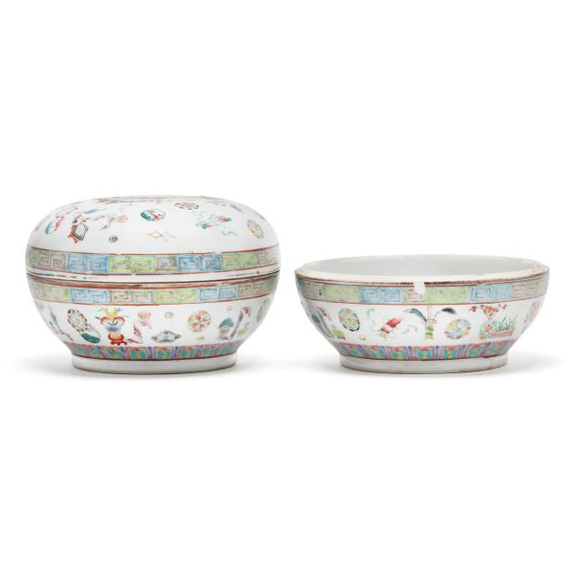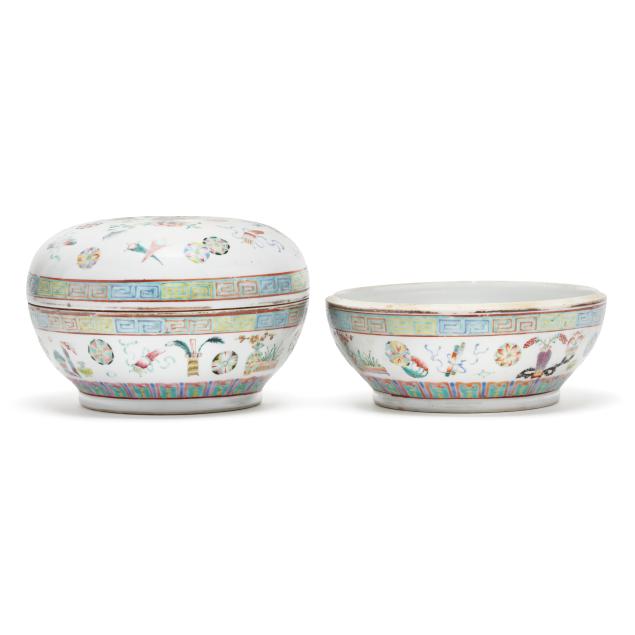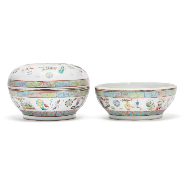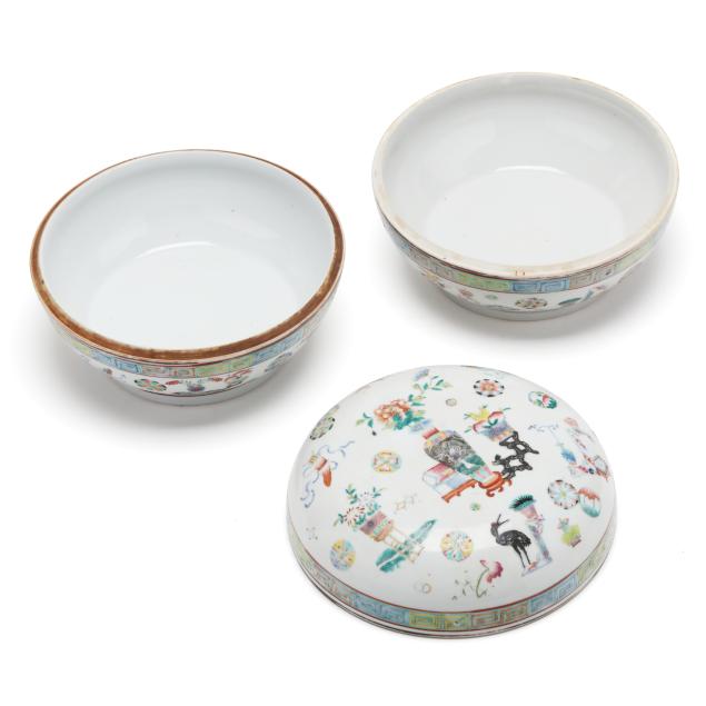 Early 20th century, includes two porcelain bowls and painted in a famille rose palette with antiques and scholar motifs, one bowl has a cover, key motif around the rim of both bowl and cover, with a mark in iron red to underside of each bowl.