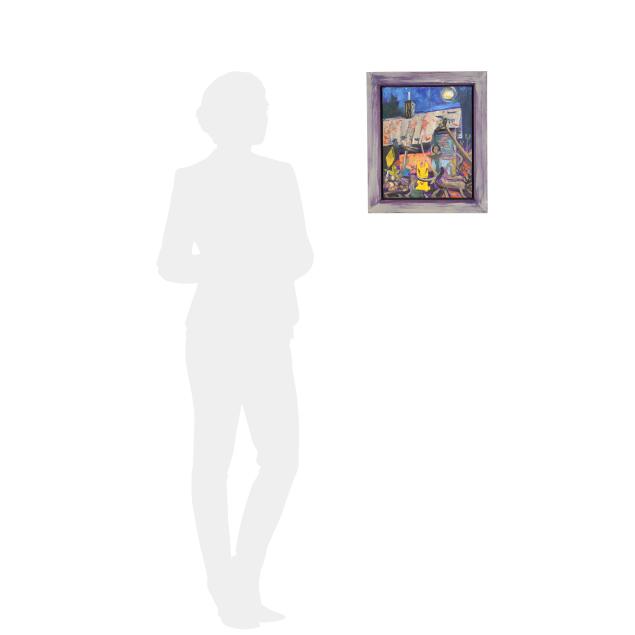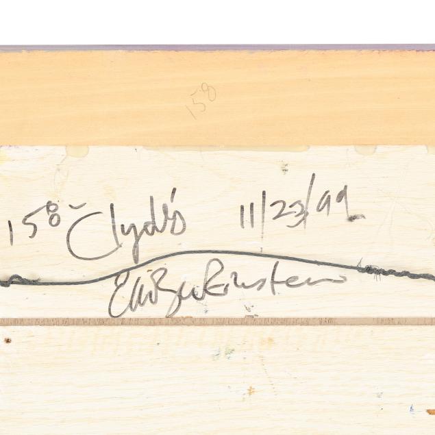 This work depicts Clyde Jones' iconic Bynum, North Carolina home "Critter Crossing", where he made his critters, as well as paintings of penguins, butterflies, elephants, and pandacows (his version of the Belted Galloways in residence at Fearrington Village), since 1982. In addition to welcoming any and all fans to see his creations at his home, he also did a variety of demonstrations and benefit events for local organizations and charitable causes. In 2002, the Chatham Arts Council honored him as the first “Chatham County Cultural Treasure” and held the first Clydefest in his honor.