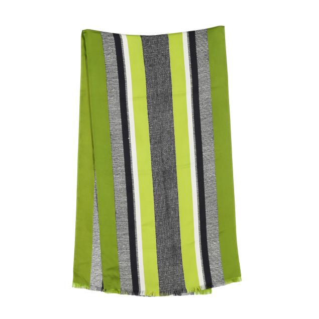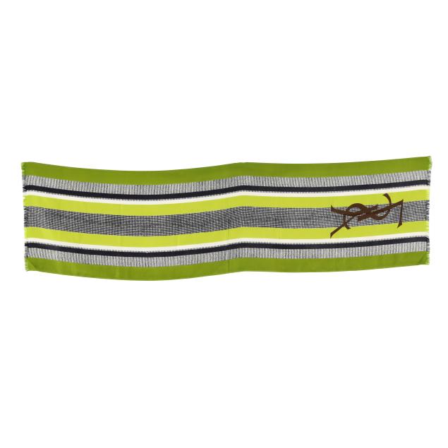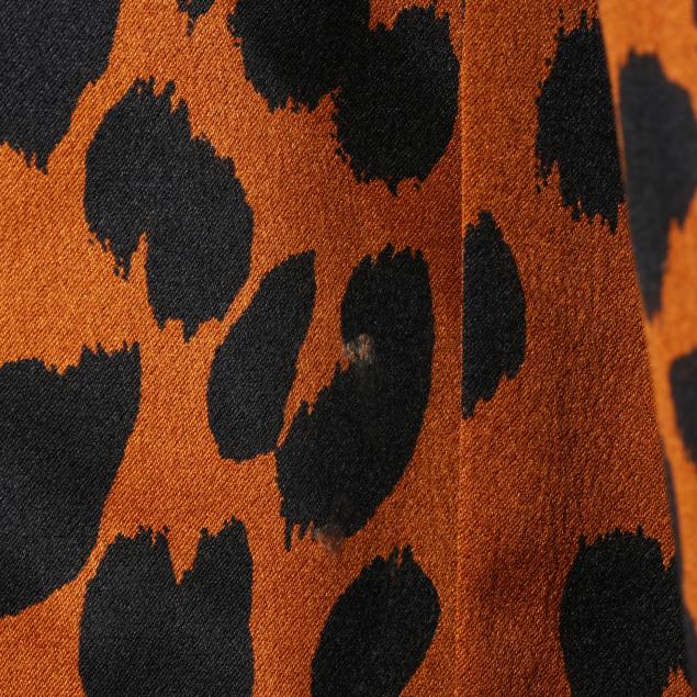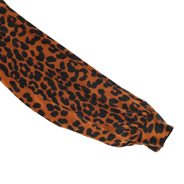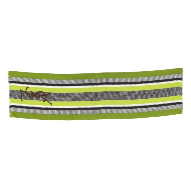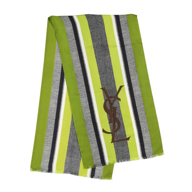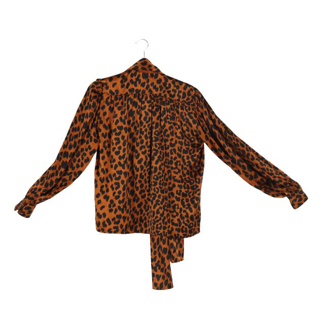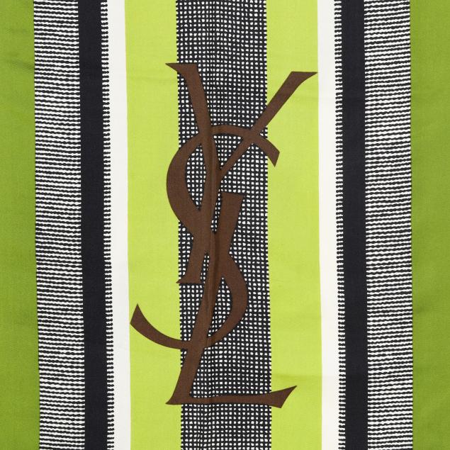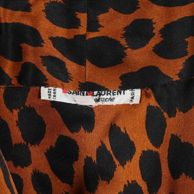Made in France, brown and black animal print blouse with attached tie, v-neck, button cuffs, labeled Saint Laurent Rive Gauche (size 38; shoulder 14.75in.; bust 20 in.; sleeve 24 in; overall length 23 in.); along with a scarf in green, black, and white, and with brown YSL logo (67 x 17.75 in.).