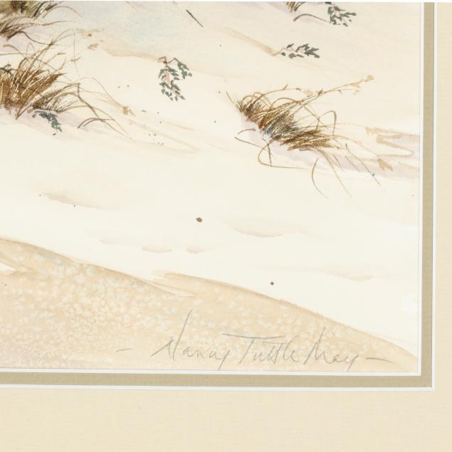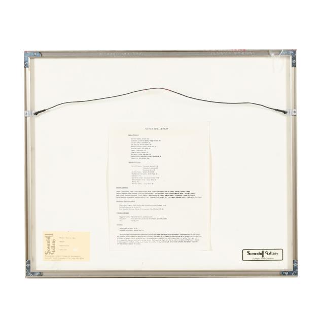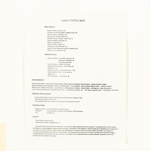 Nancy Tuttle May has been a fixture in the arts community of Durham, North Carolina for many years. She studied at Wake Forest University, and later at the Università per Strainieri di Perugia, Italy and Université Canadienne en France in Villefranche-sur-Mer, France, before returning to the United States to live and practice. Tuttle May's works - abstract and color field in style - are present in many collections, including the Duke University Medical Center, Durham; Weatherspoon Art Museum, Greensboro; SAS Institute, Cary; Nations Bank, United States and Australia; and The Breakers, Palm Beach.