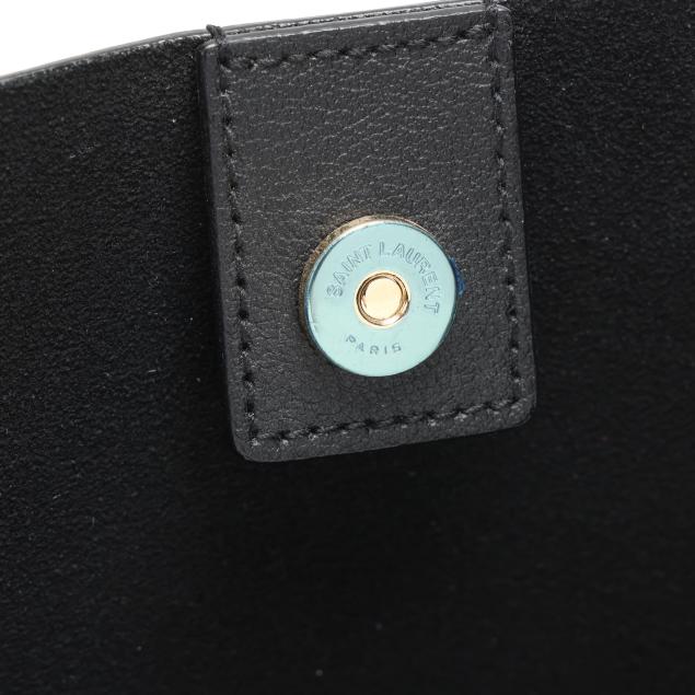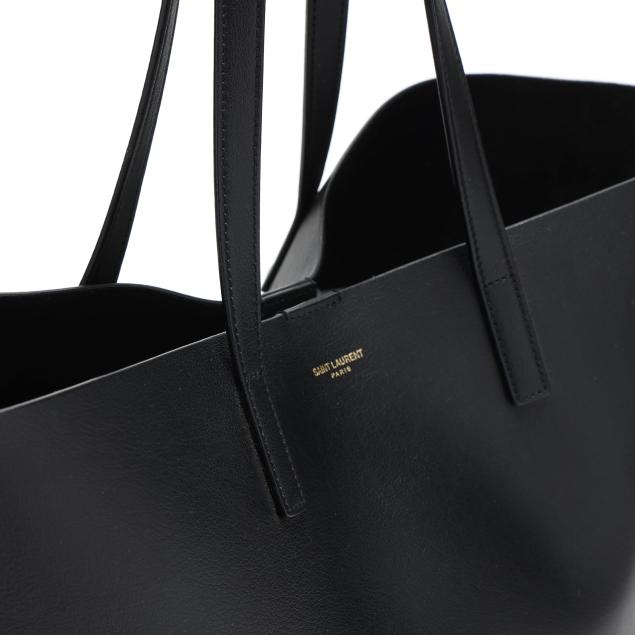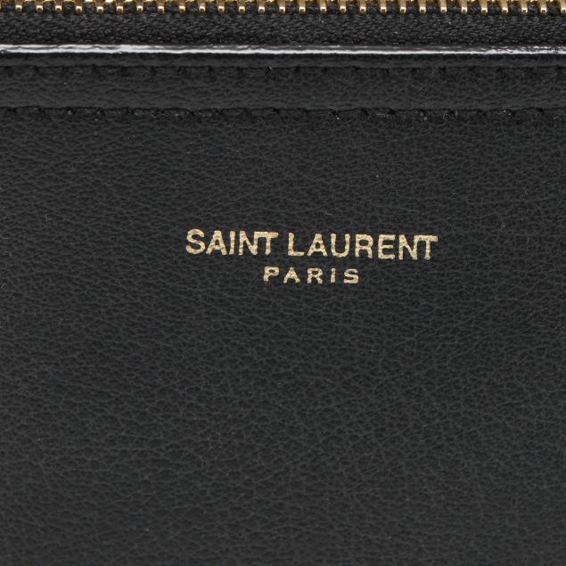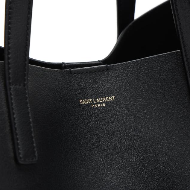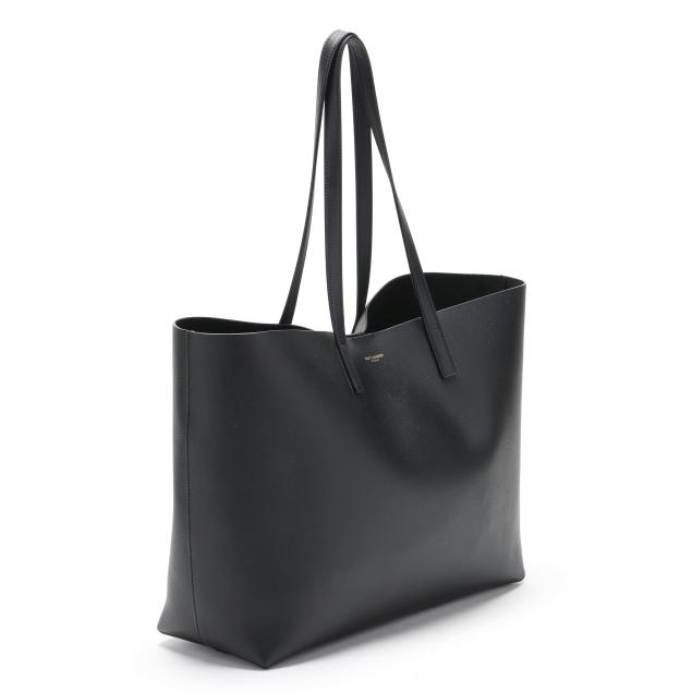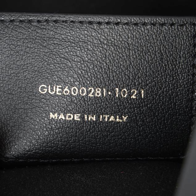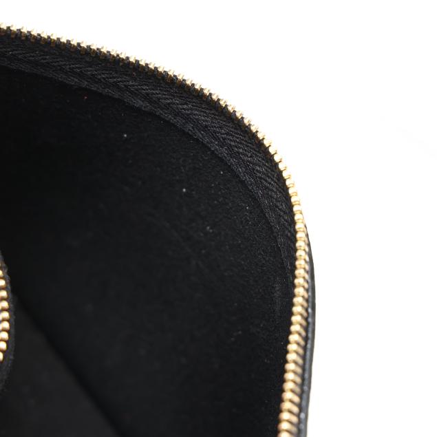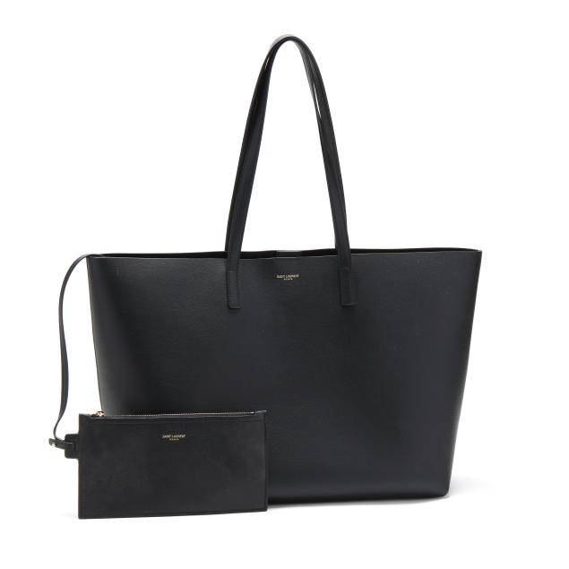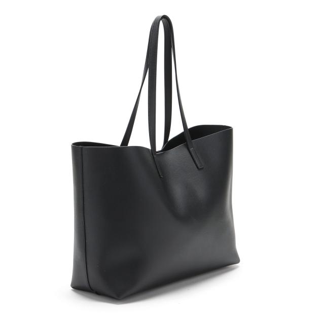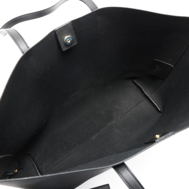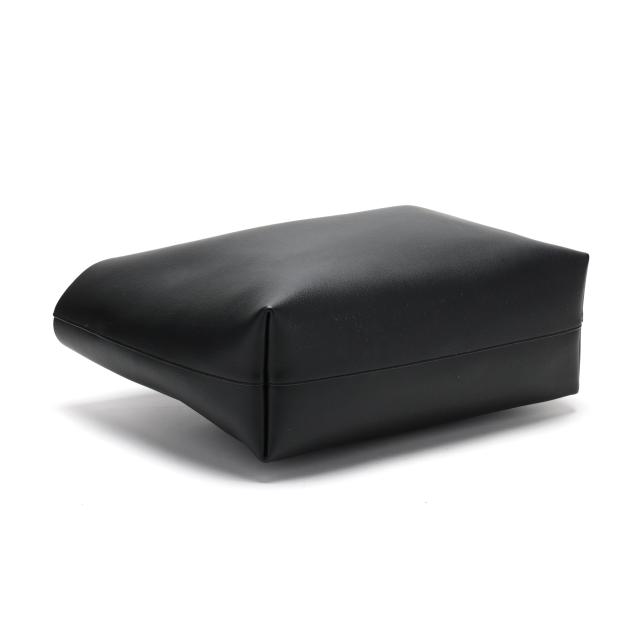 The exterior in black leather with brand stamp and flat leather handles; the interior unlined with magnetic closure and with detachable zipped purse and leather brand tag stating made in Italy.