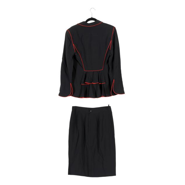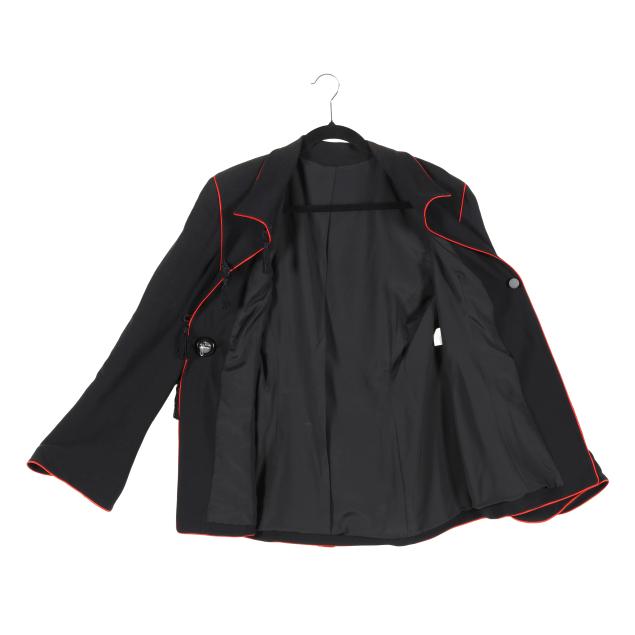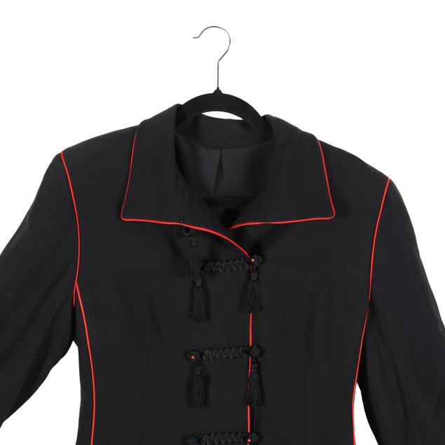Black jacket with red trim, split cuff, braided knot button closure with red glass beads, coordinating black skirt, zipper and button closure to back.