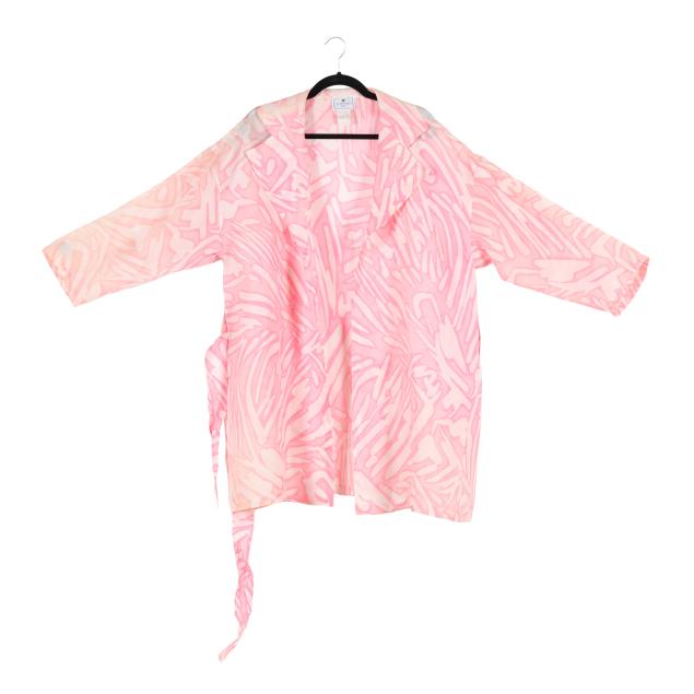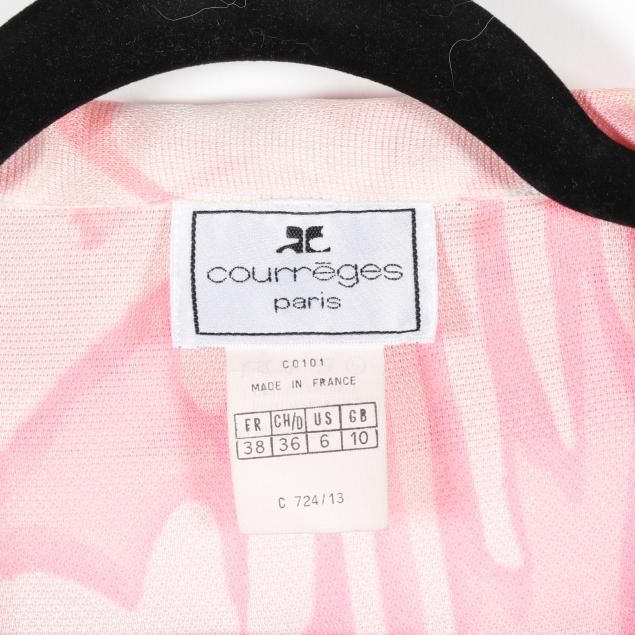 Made in France, pink and white graphic design single breasted, with tie belt, labeled Courréges Paris.