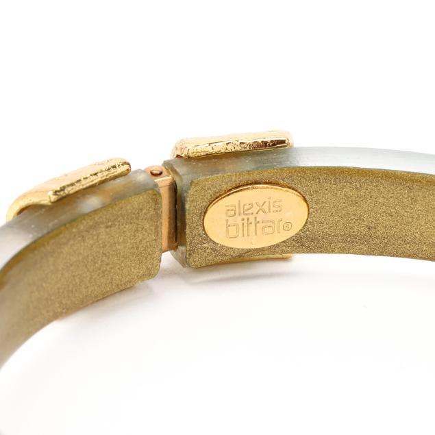 Painted lucite bangle bracelet, with hinge and magnetic closure, stamped with maker's mark (8.8mm; 7in. interior circumference); and a painted lucite ring, unmarked (17mm; ring size 5.5).