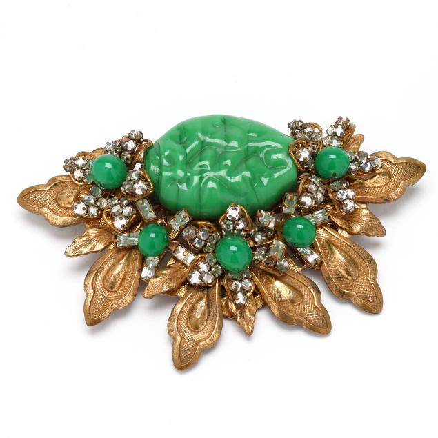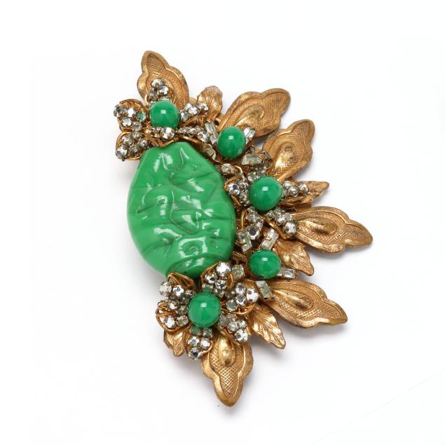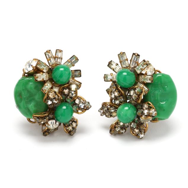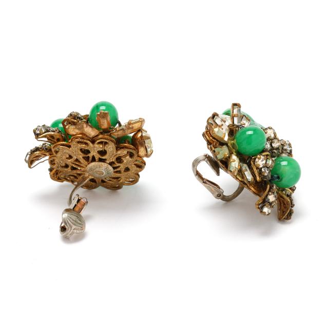 Floral motif brooch with green glass beads, rhinestones, and gold-tone mounts, completed with a single locking pin stem (2 x 3.5 in.); the earrings en suite and with a clip back, each with maker's mark.