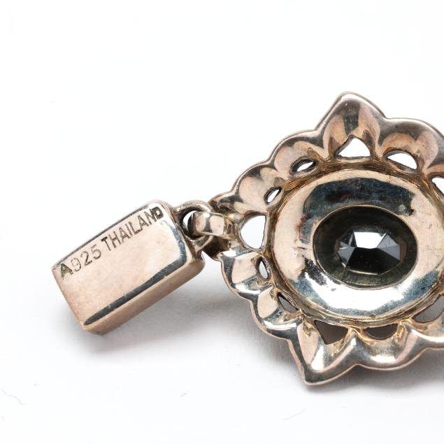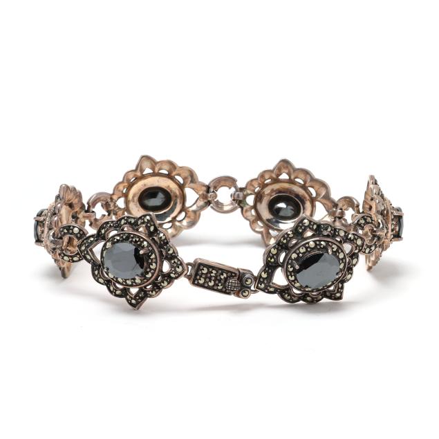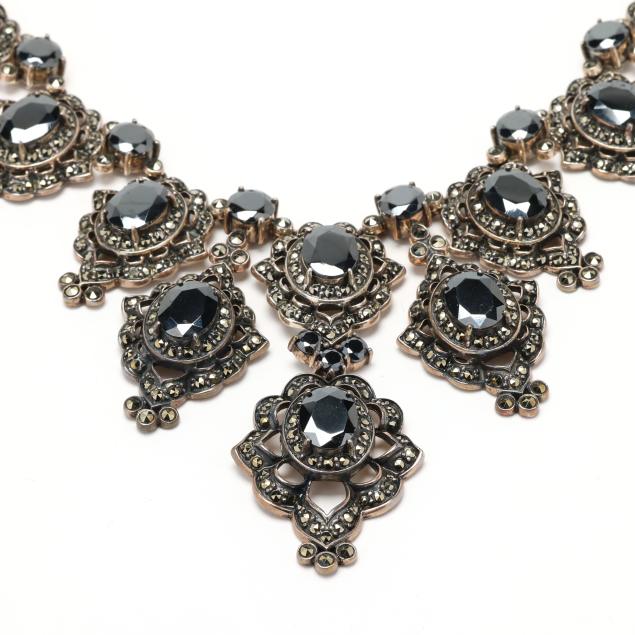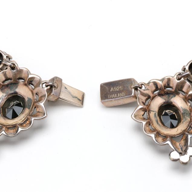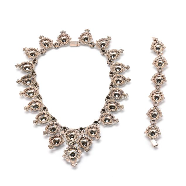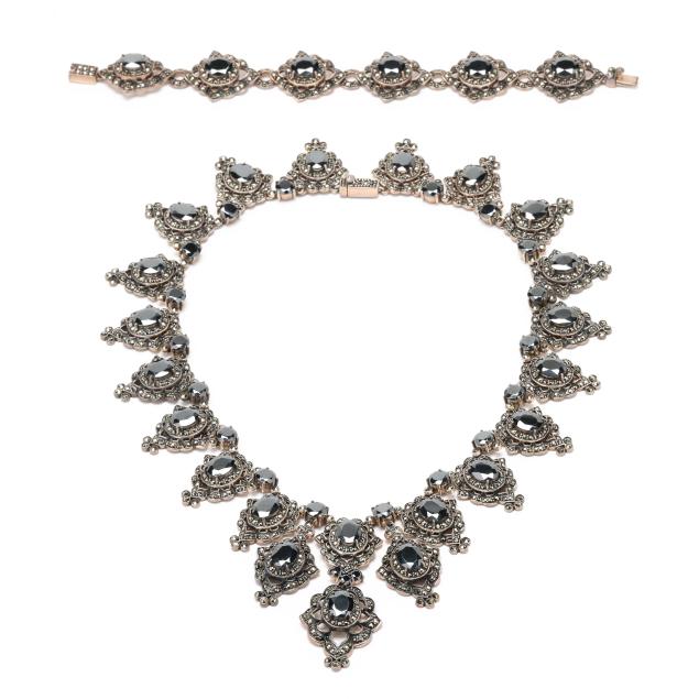 Georgian style necklace in silver with faceted glass and marcasite detailing, completed with a box clasp (17 in.); the bracelet en suite and completed with a box clasp (7.75 in.), marked A925 Thailand.