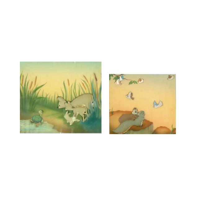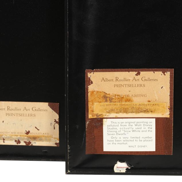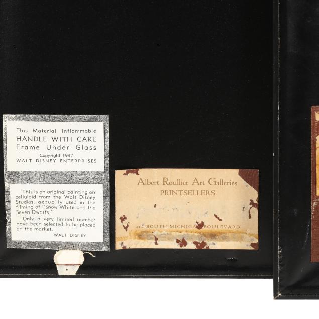 Hand-painted on celluloid acetate, 1937, unsigned, with Walt Disney labels affixed to verso, matted and framed under glass.