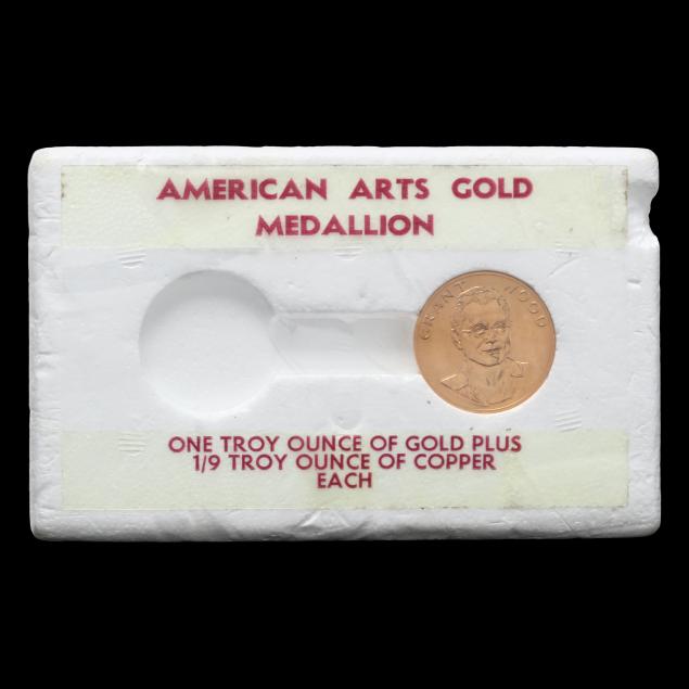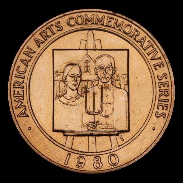 As part of the American Arts Commemorative Series, this .900 fine gold medallion features visual artist Grant Wood on the on the obverse and his most famous painting,
