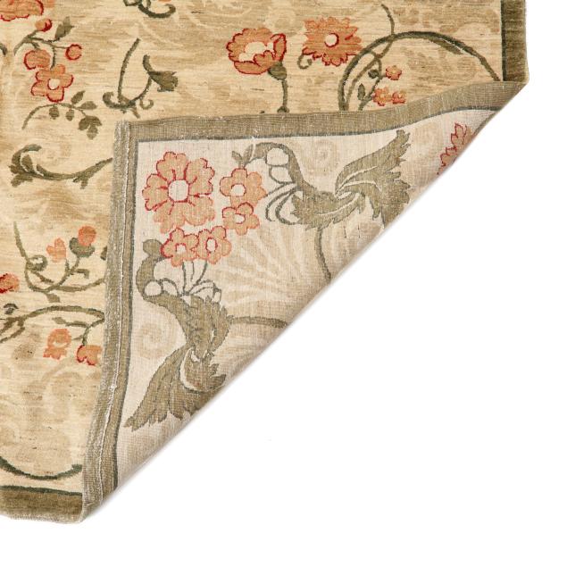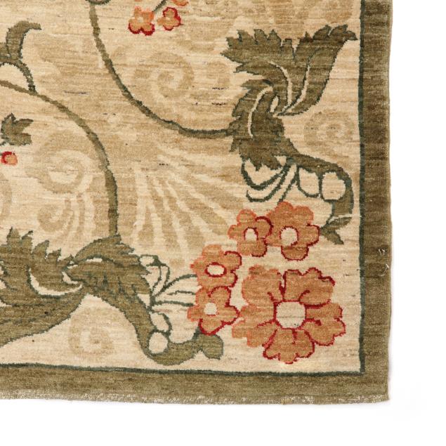 Contemporary, wool on cotton foundation, the cream and tan field with allover latticework of light red floral and green foliate motifs in an Art Nouveau style, with green border, ends hemmed under.