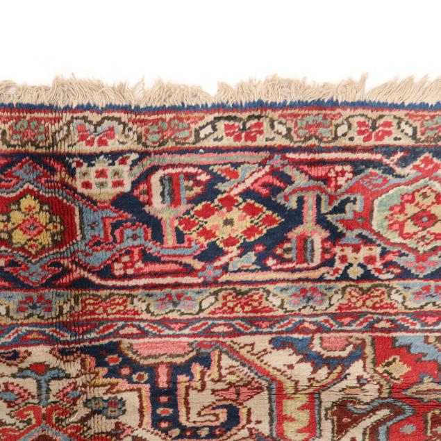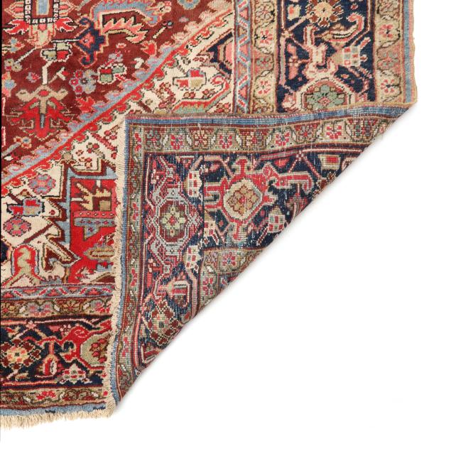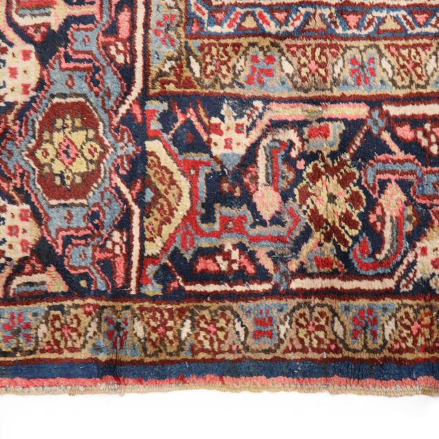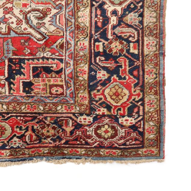 Wool on cotton foundation, dense pile, the navy blue and red lobed star medallion bursting onto a field of red filled with floral and foliate motifs, with spandrels, the navy blue border with stylized floral and foliate motifs within minor borders.