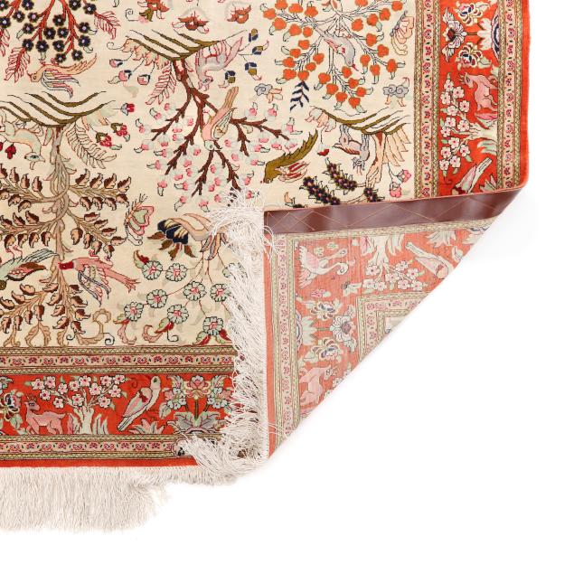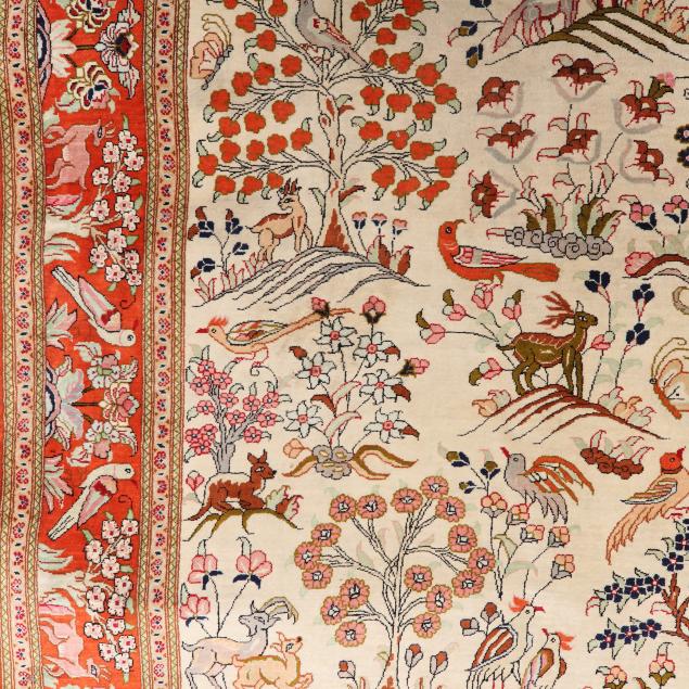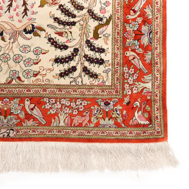 Silk on cotton foundation, the cream field filled with detached foliate and vignettes with animals in landscapes, worked in browns and reds, the bright red main border with floral sprays and avian motifs, within minor borders.