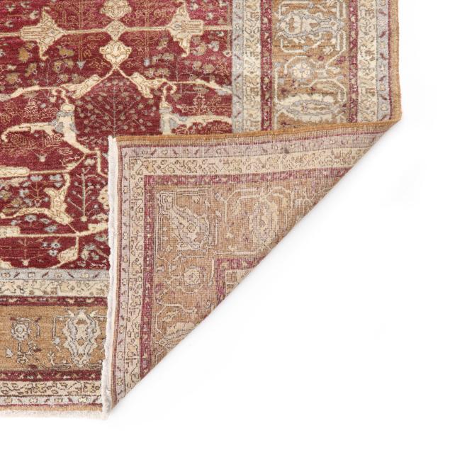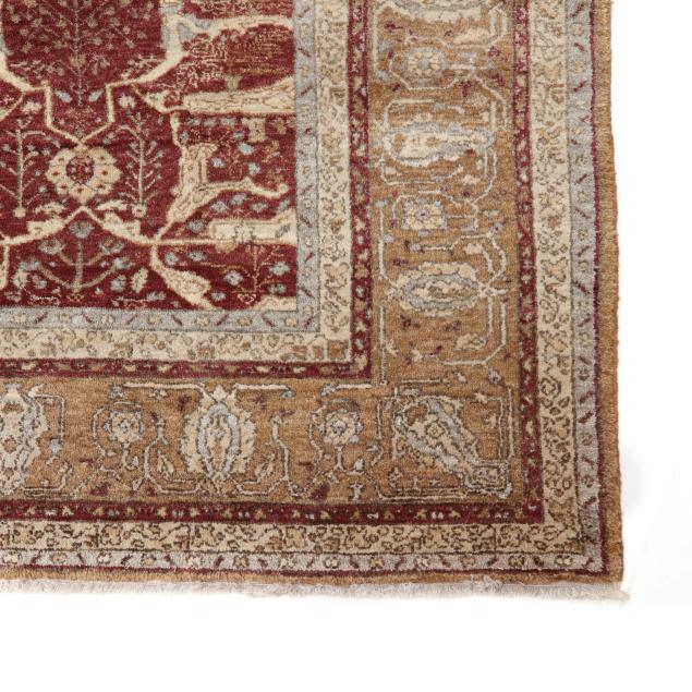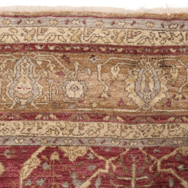 Wool on cotton foundation, the rust red field with stylized foliate lattice design in tan and pale blue, the tan main border with repeating stylized palmette motifs, within minor taupe borders, unlabeled.
