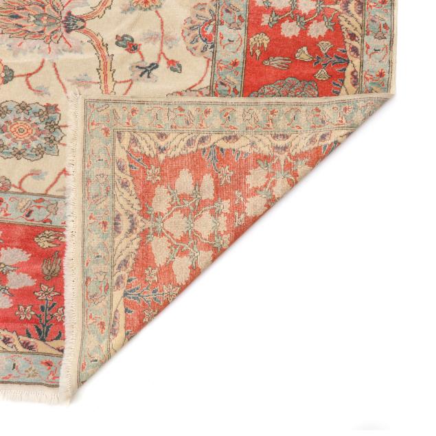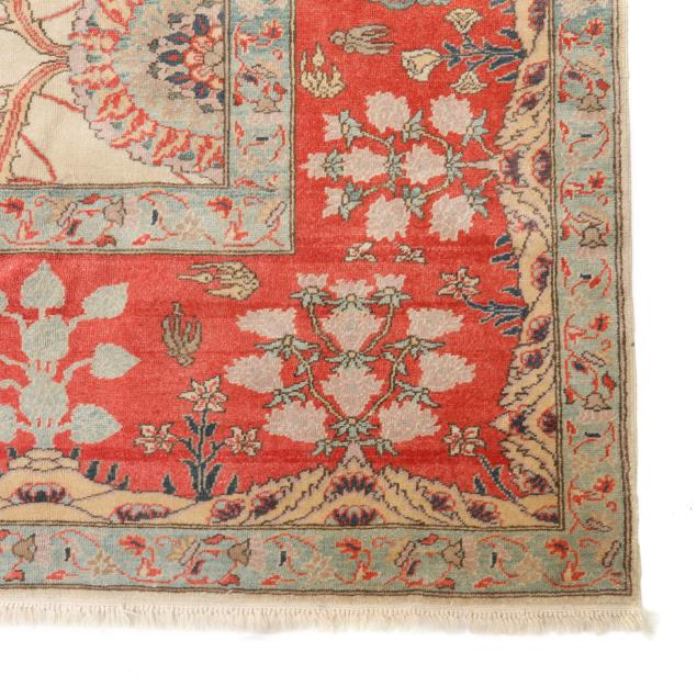 Wool on cotton foundation, the central beige field with lattice of floral and foliate motifs in coral and seafoam green; the main coral border with repeating tree of life motifs, within minor seafoam green borders.