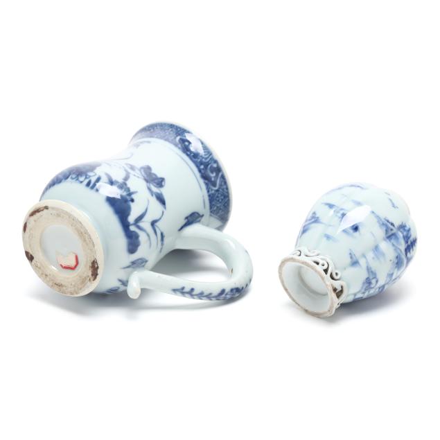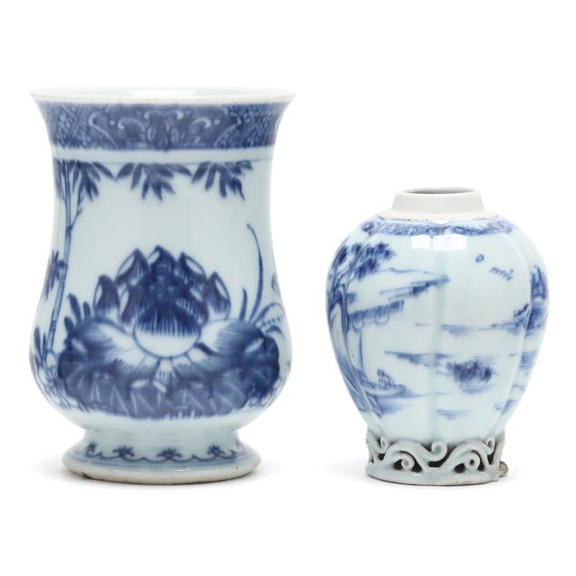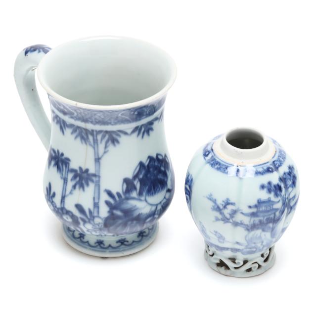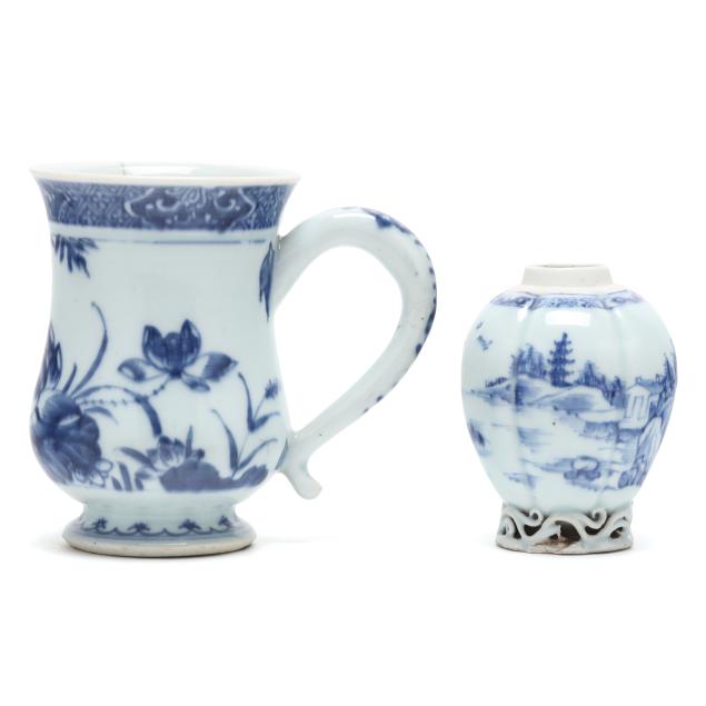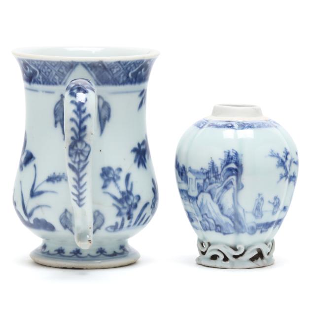 19th century, porcelain bowls hand painted in underglaze blue, the tall mug has a bulbous body decorated with lotus blossoms, a curved ear shaped handle, and short flared foot, and a tea caddy raised on a reticulated foot, the body painted with a continuous mountainous seaside landscape, both unmarked.