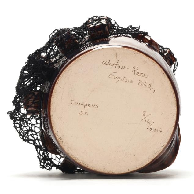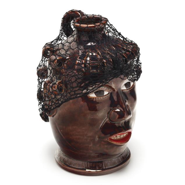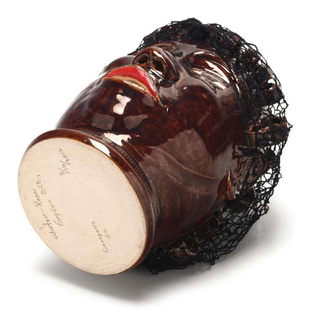 Cowpens, 2016, earthenware face jug in a rich brown/blue glaze with red lips and white eyes and teeth, applied loop curls to head with hairnet, inscribed "Winton-Rosa / Eugène / Cowpens / SC / 8/16/2016" to underside.