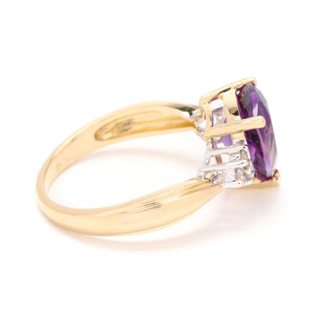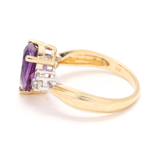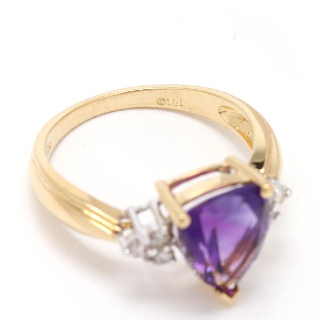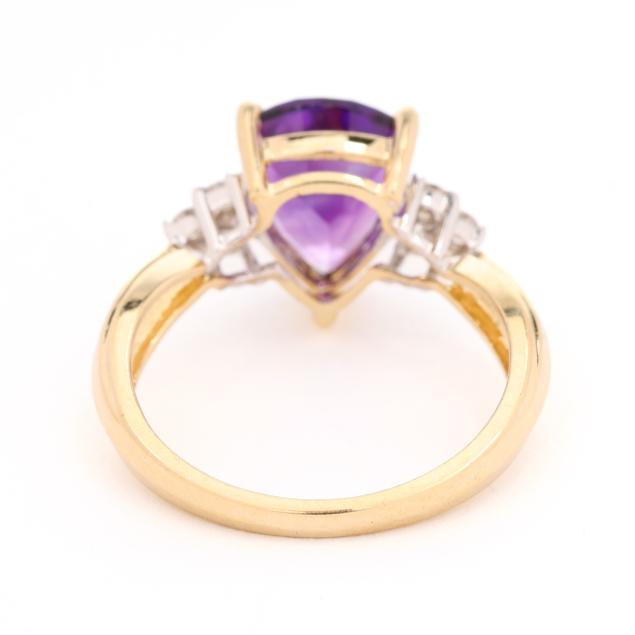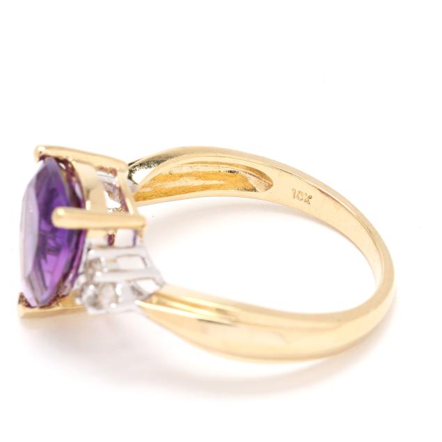Centered on a pear cut amethyst (10 x 8mm) weighing approximately 2.25 carats, the shoulders set with full cut round diamond melee in a trefoil design, shaped shank, stamped 10K and with maker's mark LGL.