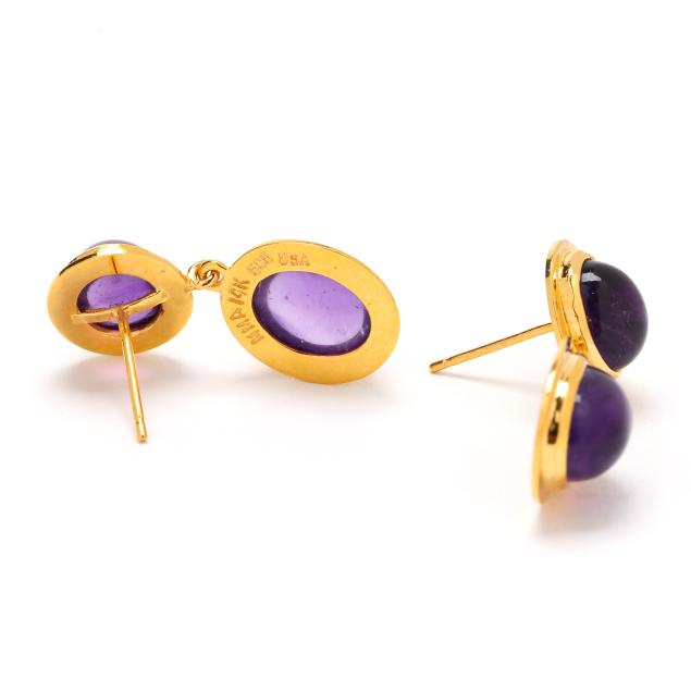 20th century, the surmount a horizontally oriented oval cabochon amethyst, suspending an oval cabochon amethyst, each bezel set in a gold mount, completed with posts and push backs, stamped MMA 14K 585 USA.