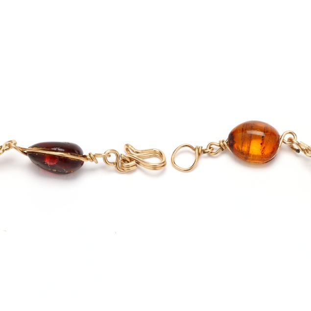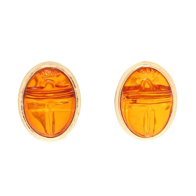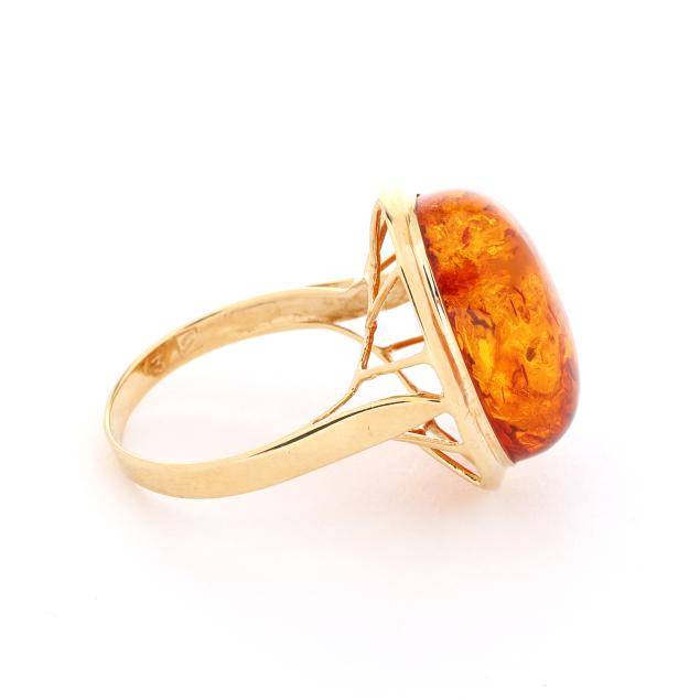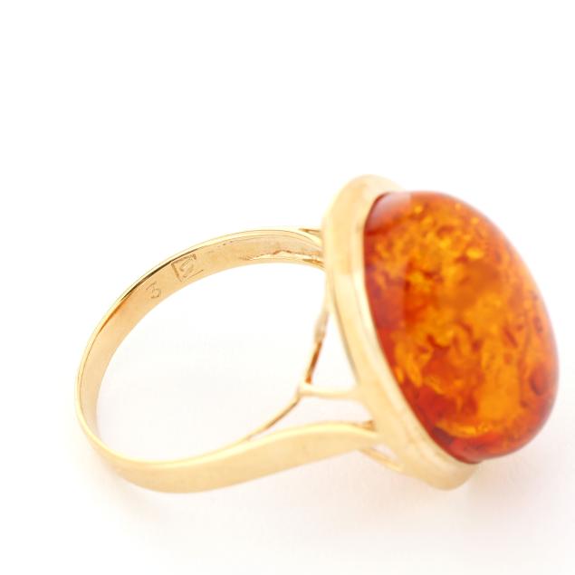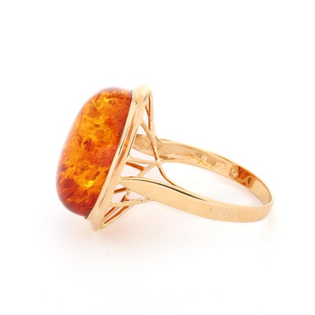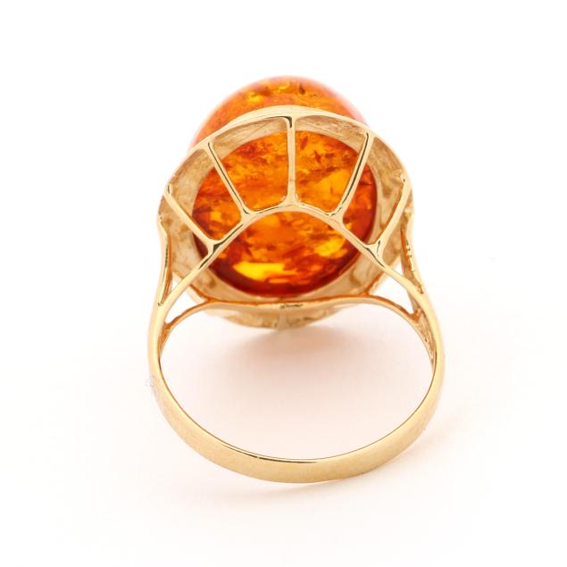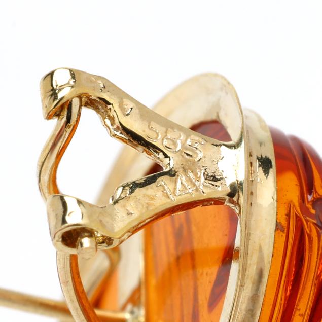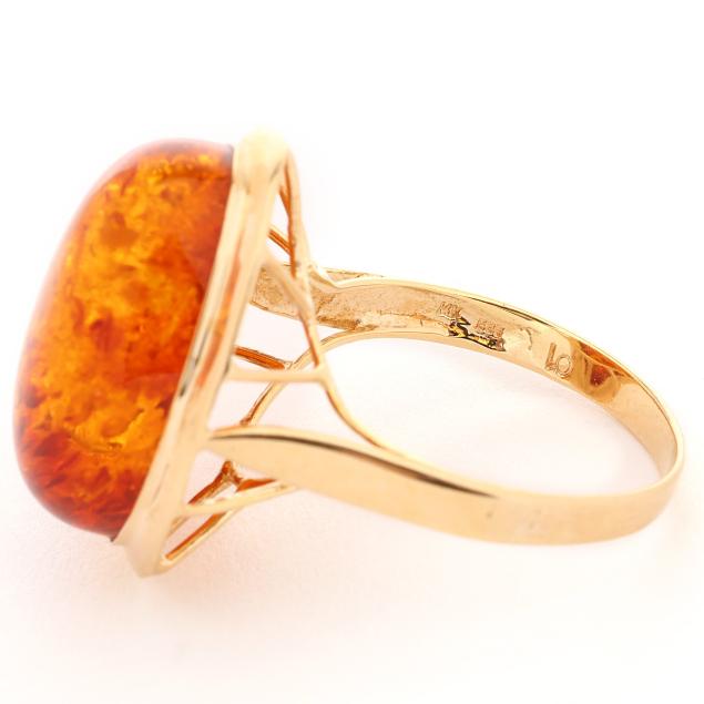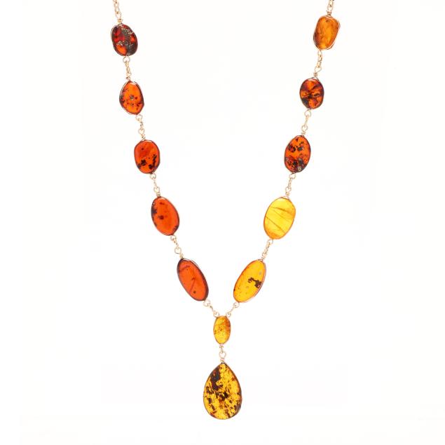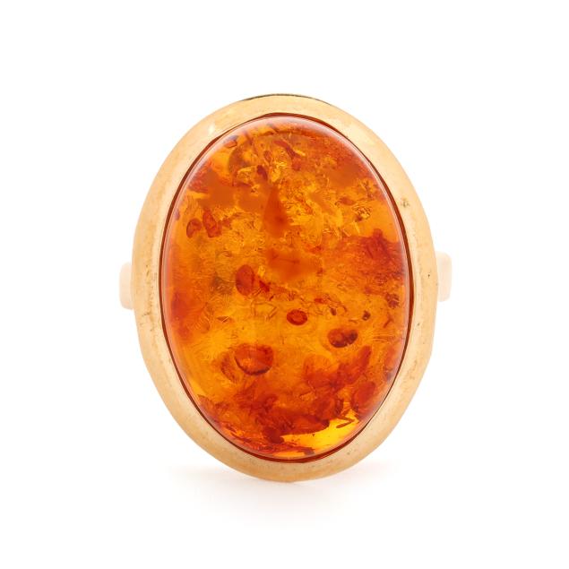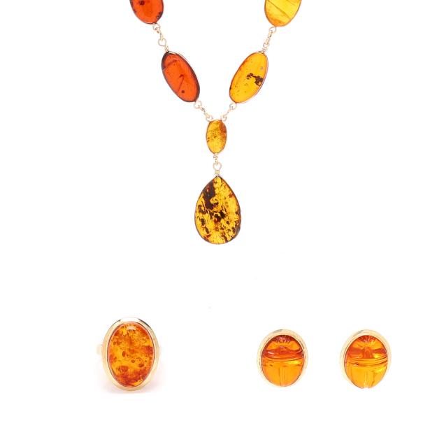 To include: a necklace comprised of graduated amber cabochons set in gold wire and suspending a pear cabochon amber drop, completed with a hook and eye clasp, testing 10KT (20 in.) (nicks and pits to amber); a ring bezel set with an oval cabochon amber (18 x 13mm), stamped 14K 585 (ring size 6.75); and a pair of earrings, the carved oval amber (16 x 12mm) in a scarab design, bezel set, and completed with posts and clip backs, stamped 14K 585 (.75 x .5 in.).