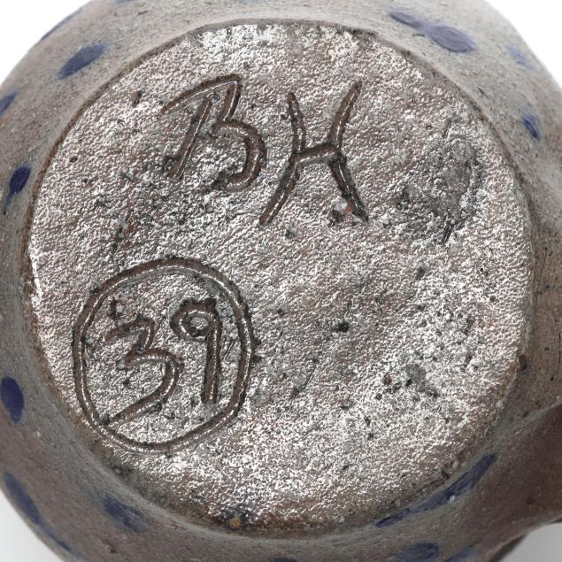 Stoneware face jug with applied features, cobalt decoration, and porcelain teeth, initialed "BH" and marked "39" to underside.