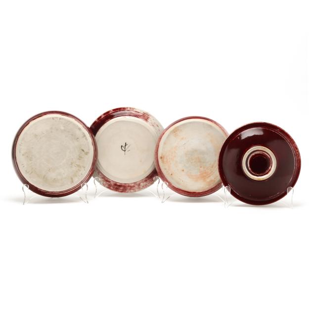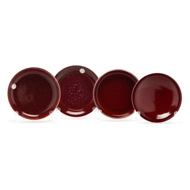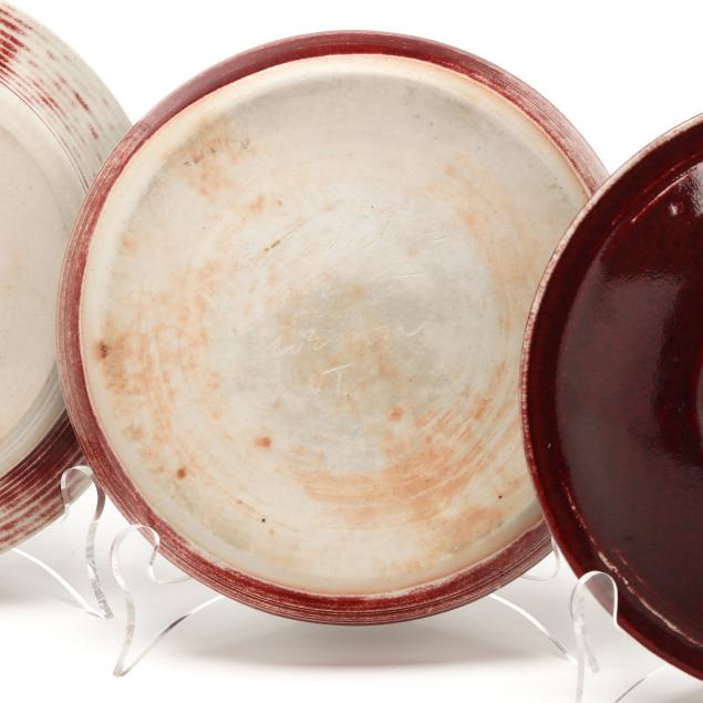 Late 20th century, variously glazed porcelain dishes, all but one red dish variously inscribed or marked with Benzanson's artist ciphers or inscribed "Benedictine Monks Weston Vermont [artist's cipher]" to underside.