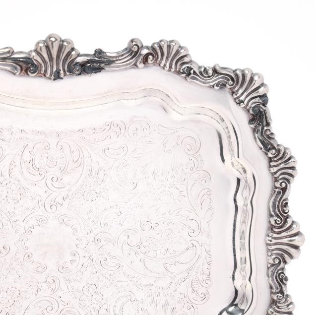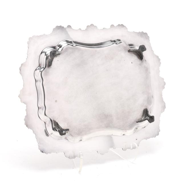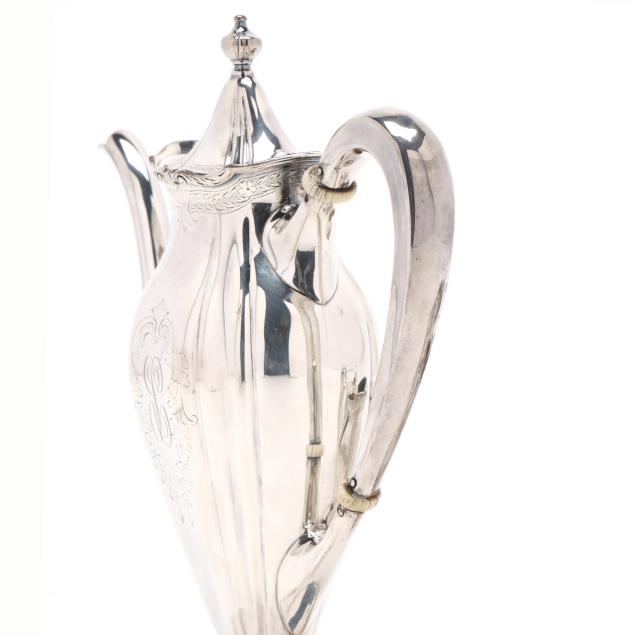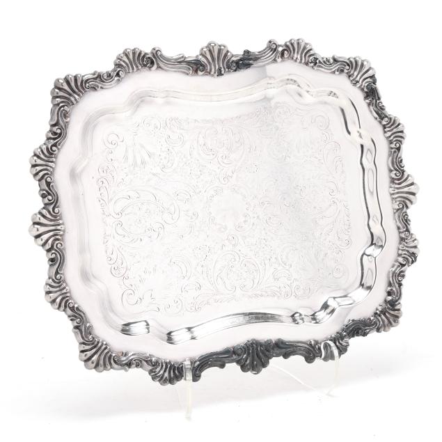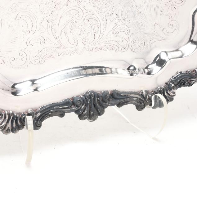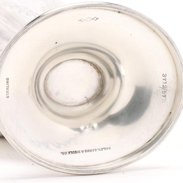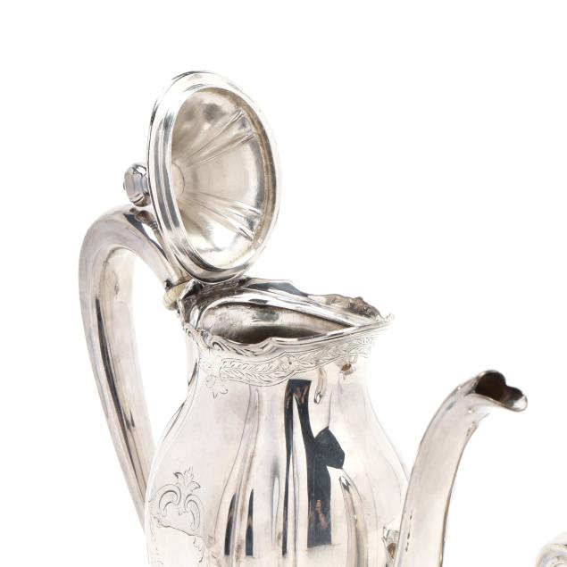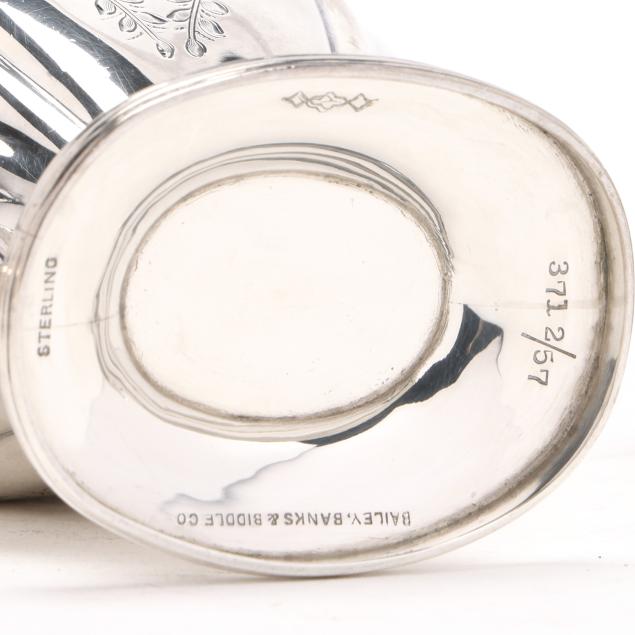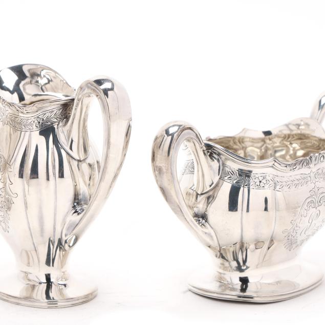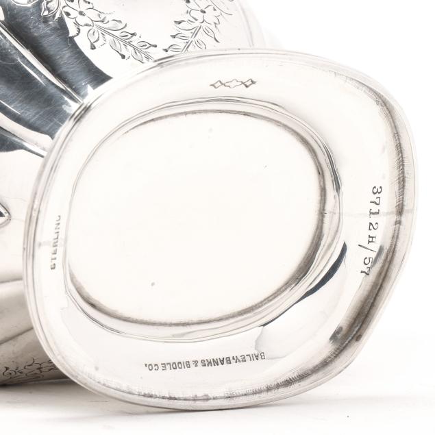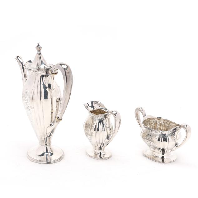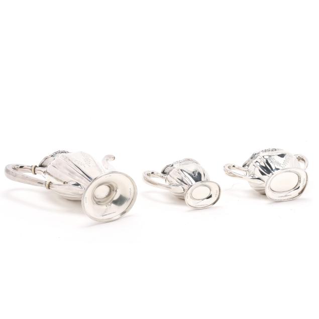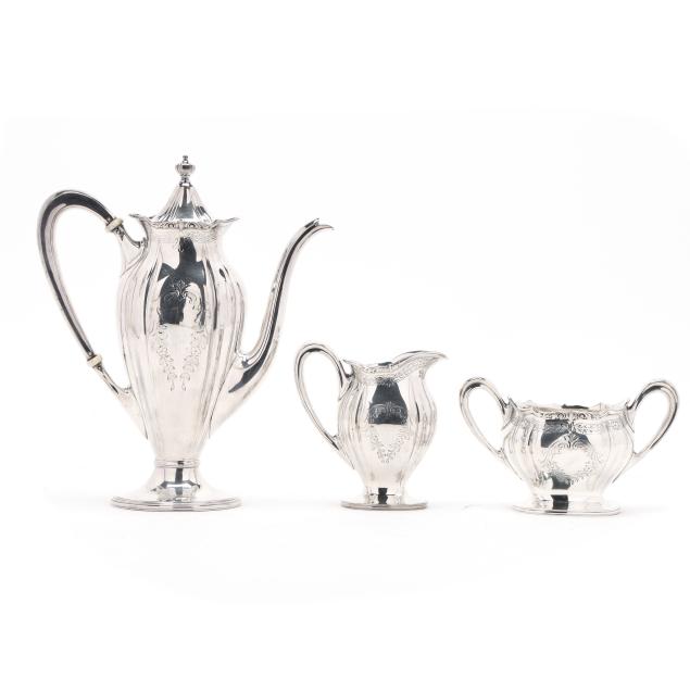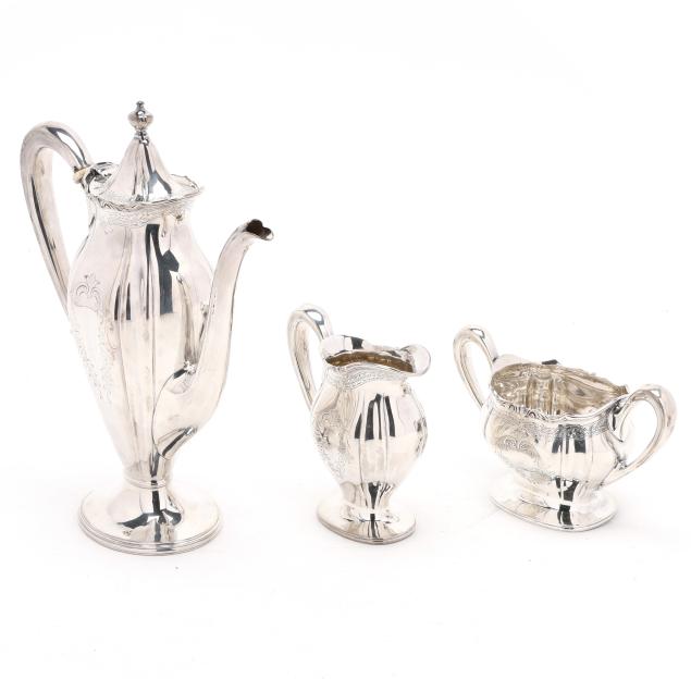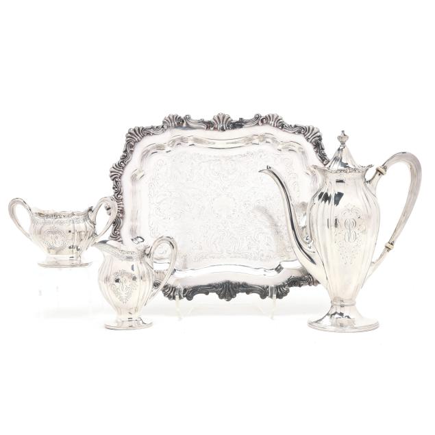 Pattern number 3712/57H, retail mark of Bailey, Banks, & Biddle Co., featuring hand-engraved foliate decoration, and a uniform script "L" monogram, includes a coffee pot (10 1/2 x 8 1/2 x 5 in.), creamer (4 3/4 x 4 1/2 x 2 1/2), and a sugar bowl (3 3/4 x 6 1/2 x 3 1/4 in.); presented with a silver-plated tray by Rodgers (11 1/4 x 14 in.)