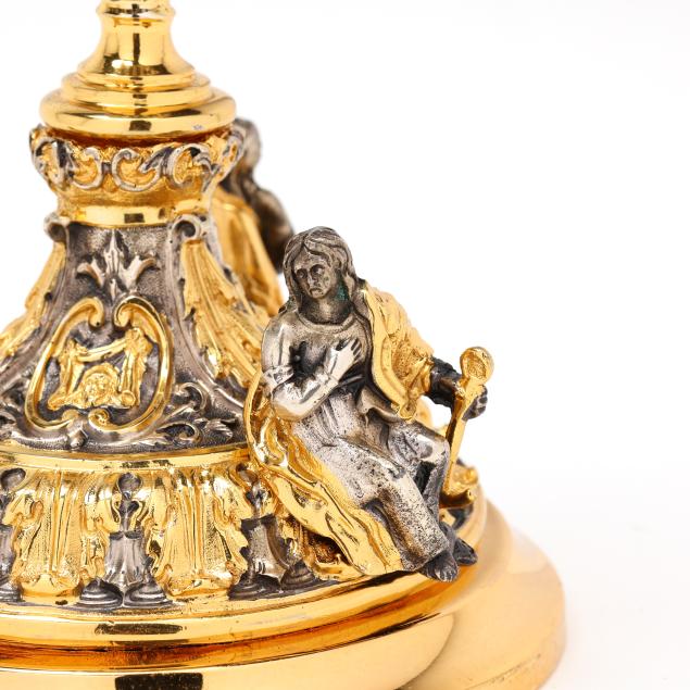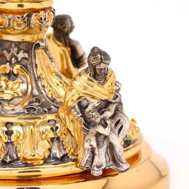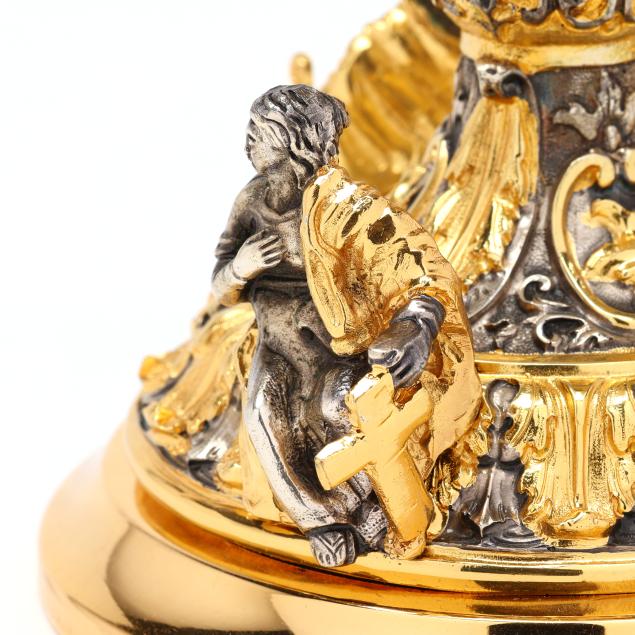 20th century, two toned silver and gilt decorated, in the baroque style with saintly figures and acanthus leaves to the base, figureheads to the shaft, and rocaille shell and cartouches to the bowl, five part assembled form, XRF tests .800 silver content.
